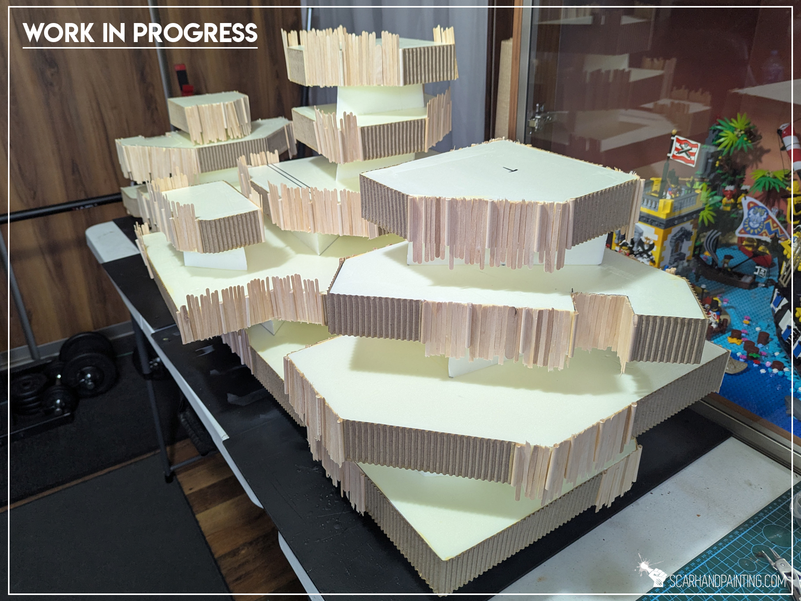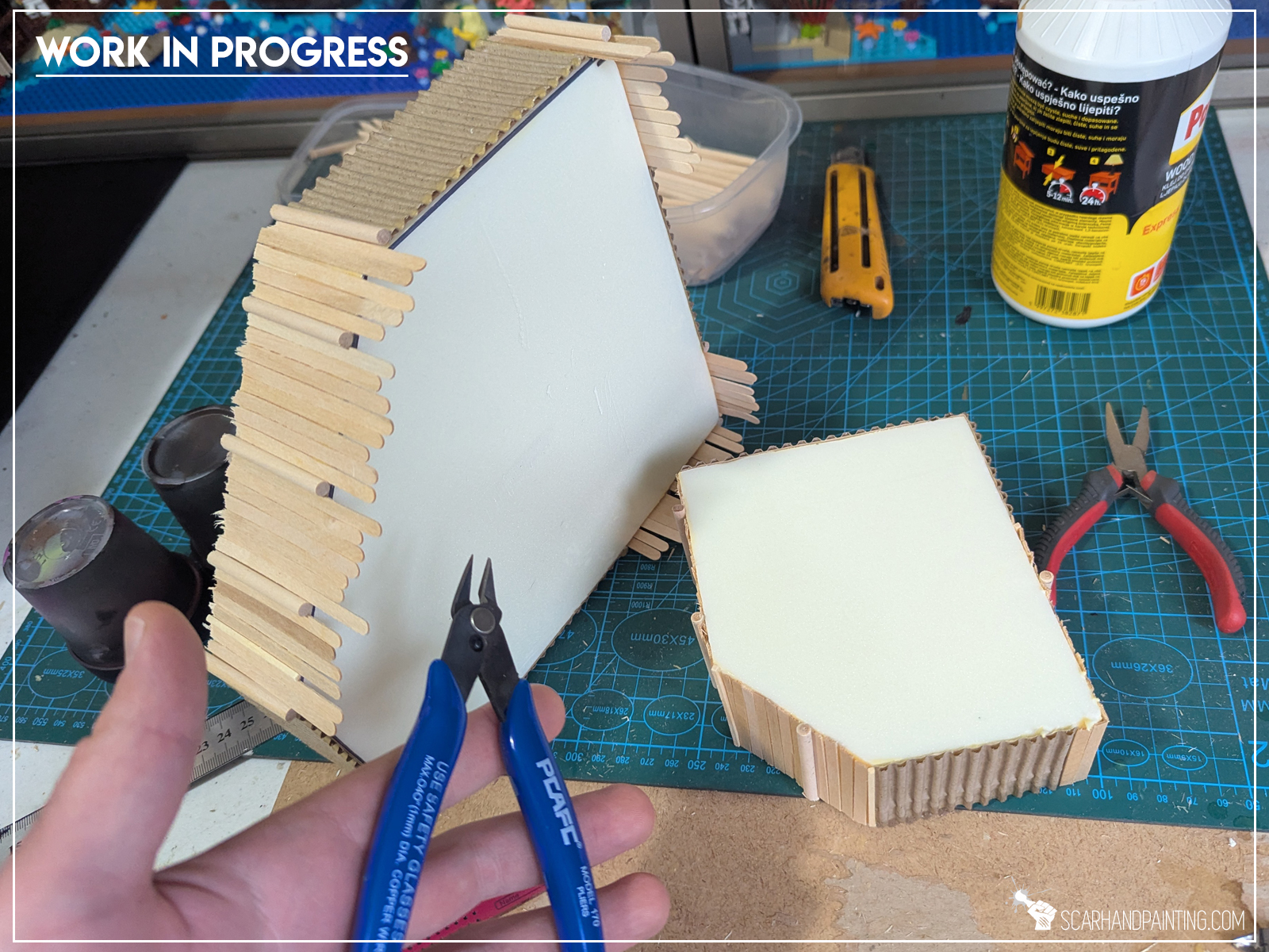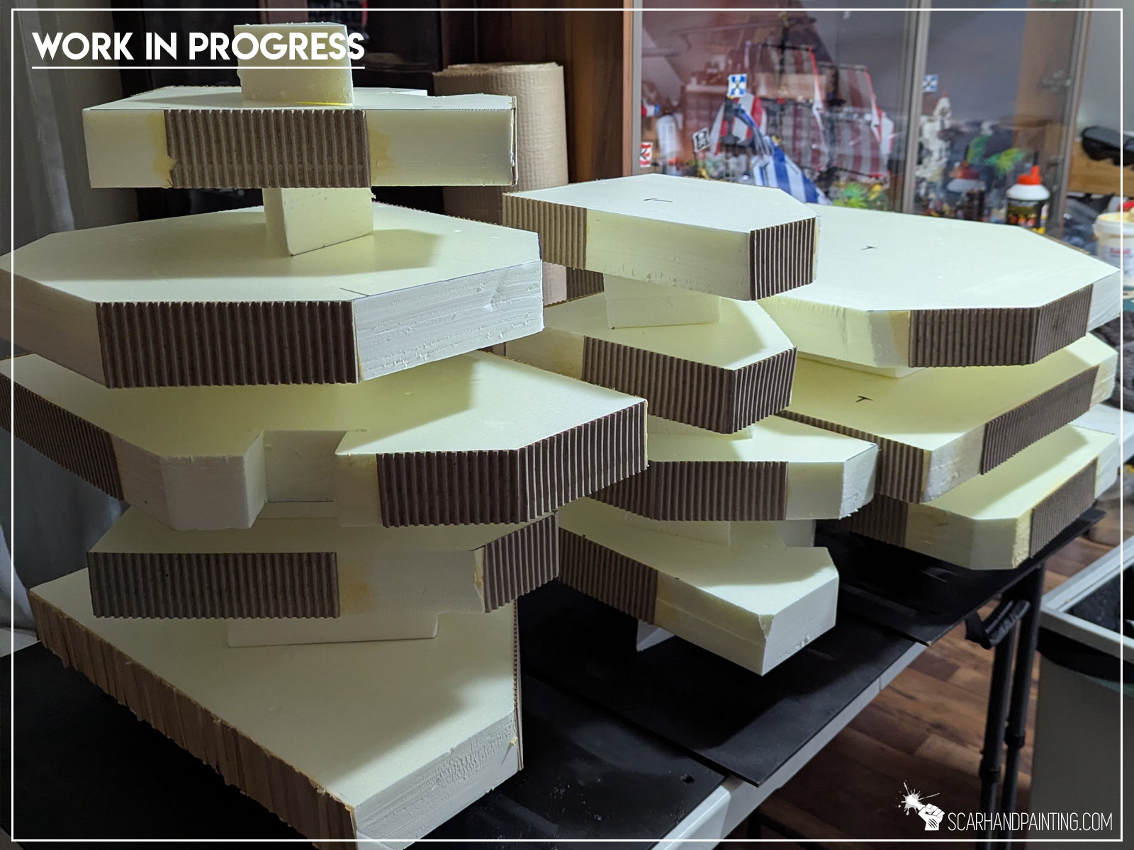 All the necessary materials ordered for the occasion arrived early on Monday. 2″ thick XPS foam, corrugated paper, wooden coffee sticks, PVA glue, lots of Cyanoacrylate glue and other stuff plus some 3d printed bitz and pieces I produced throughout the previous Weekend…