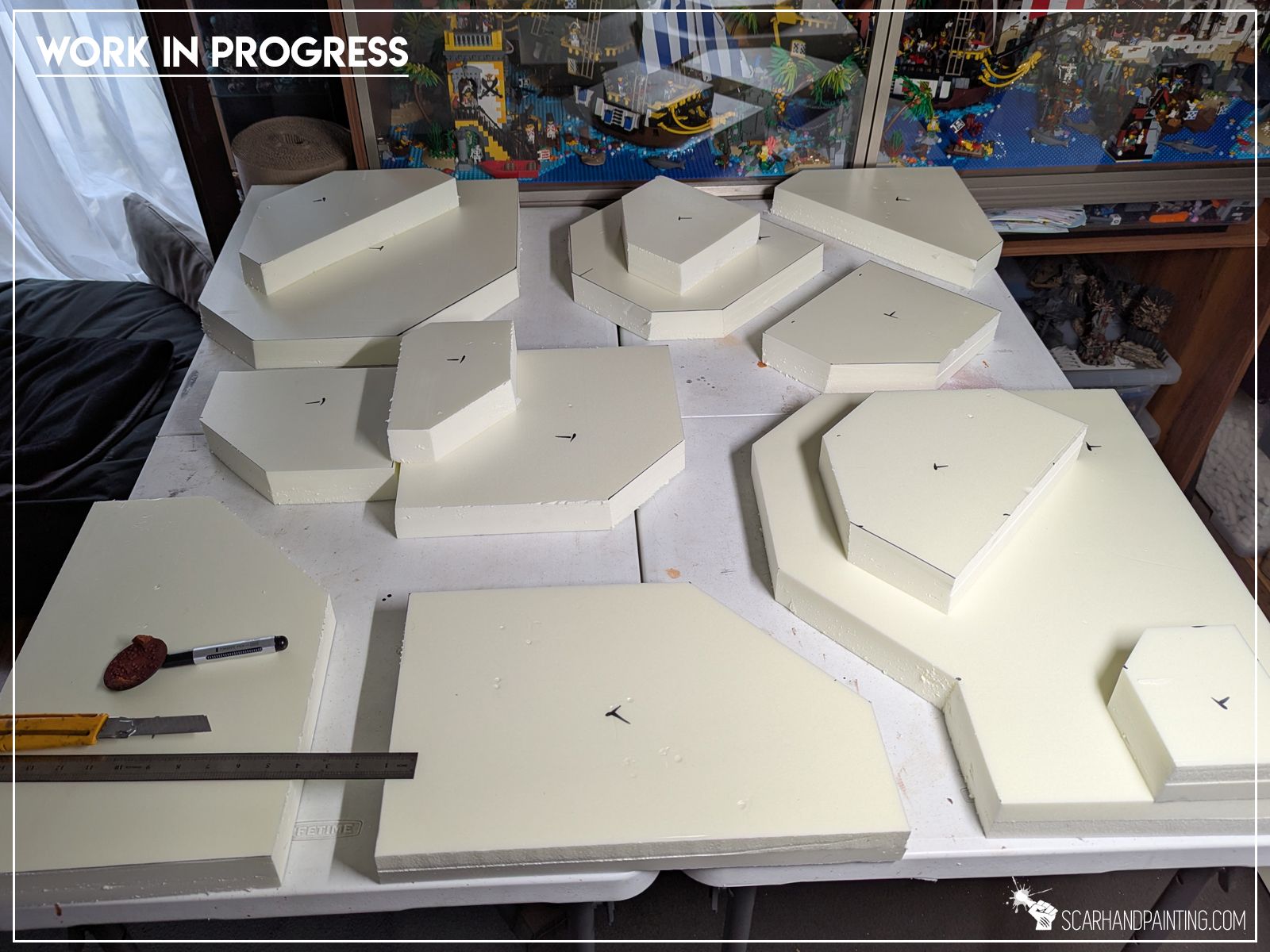 The standard process begun with copying the previous board layout 1:1, adding two more ‘shapes’ made of the leftover XPS foam to the mix. Marked, outlined then cut with an exacto knife – fast and furious, as it should be.
