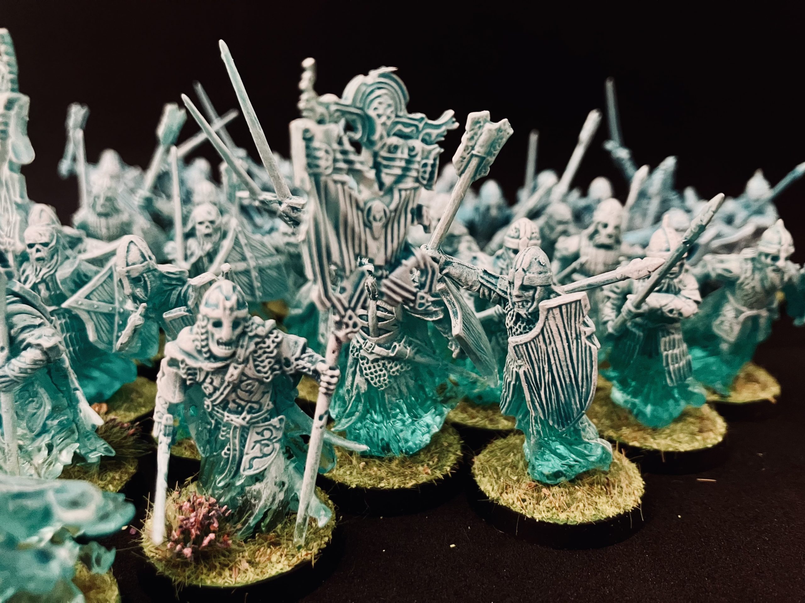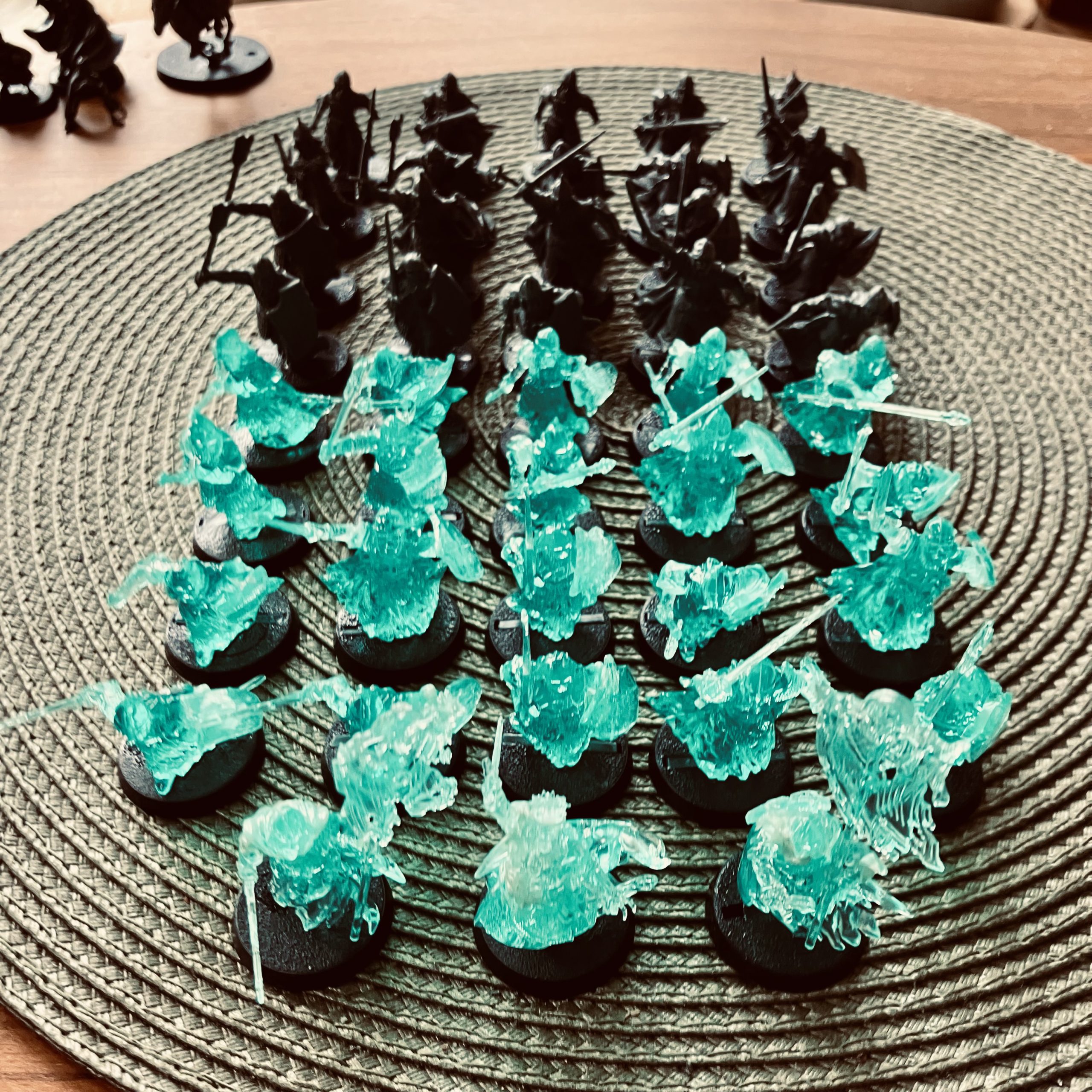 Next, I was ready to start working on the army of the dead. The Pelennor Fields box comes with twenty miniatures for the ghosts, but I was able to get hold of the limited release of miniatures molded in transparent aqua/green plastic. A box of warriors of the dead and also king of the dead with heralds.