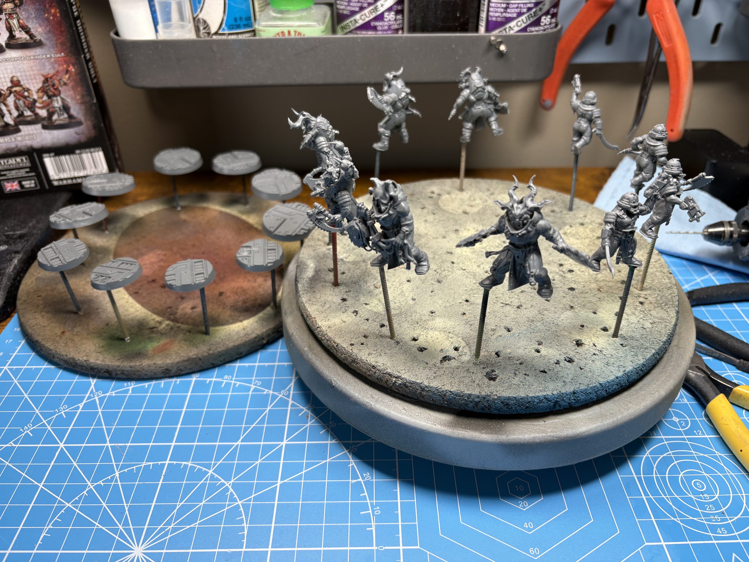 Mounted figures and bases on nails as I want to prime both different colours, as well as finish the bases in a unique way.