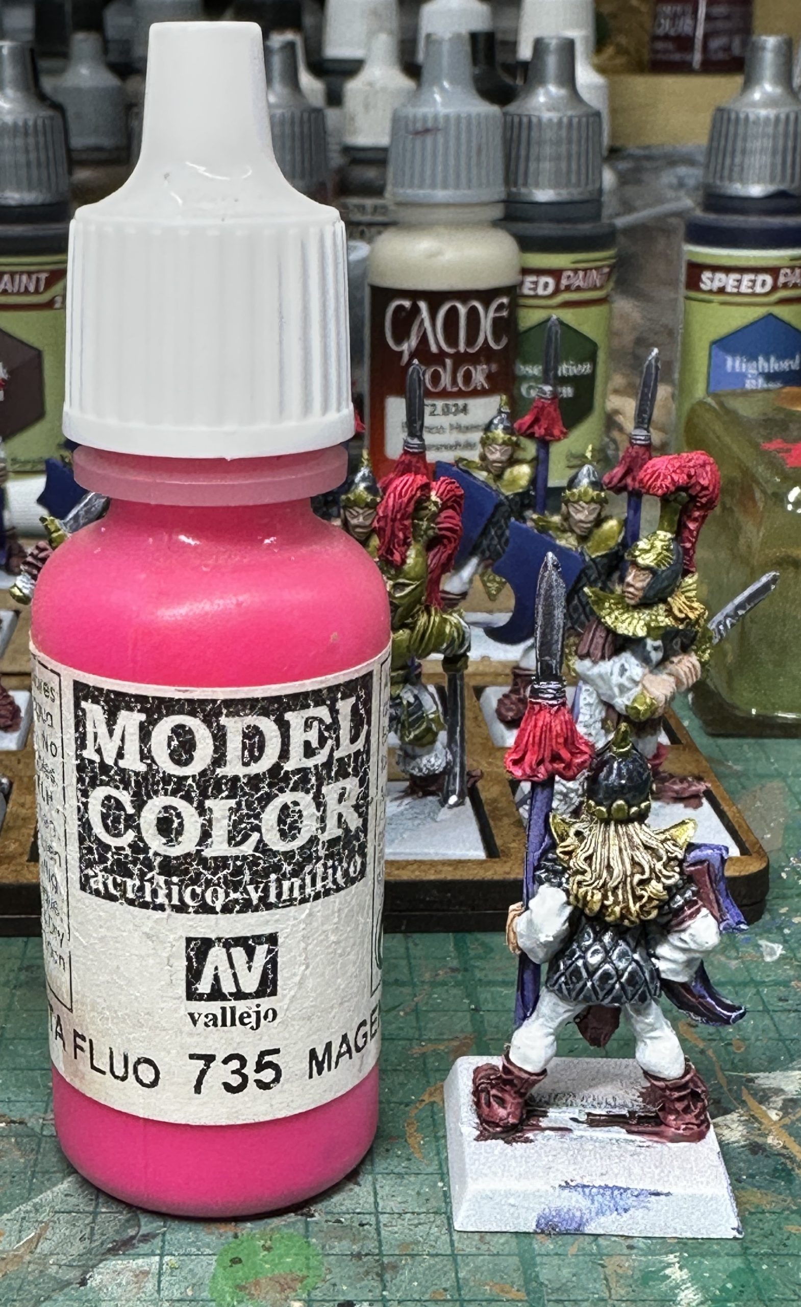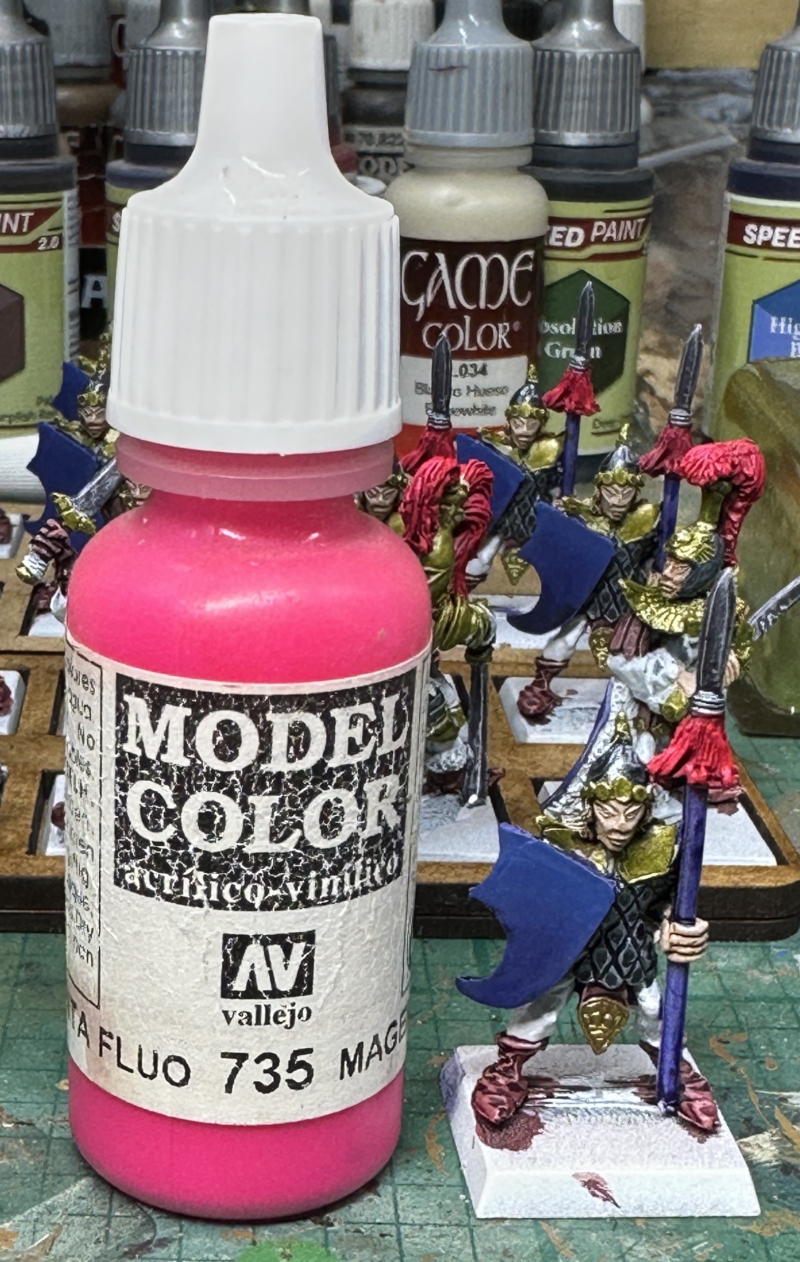 Highlights for the red were done with Magenta Fluro. This will look a bit redder on the model and give a bright but still tonally correct highlight colour. Never let it be said that elves are afraid of bright colours 😀