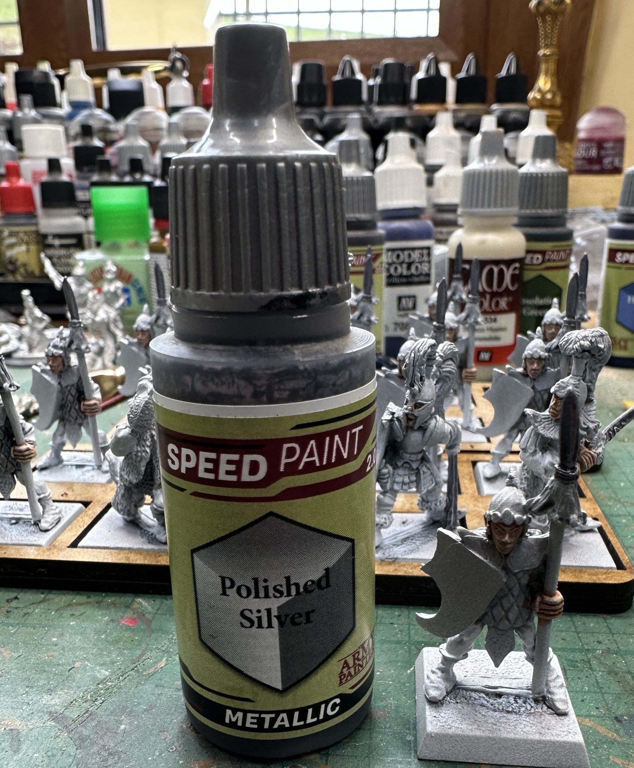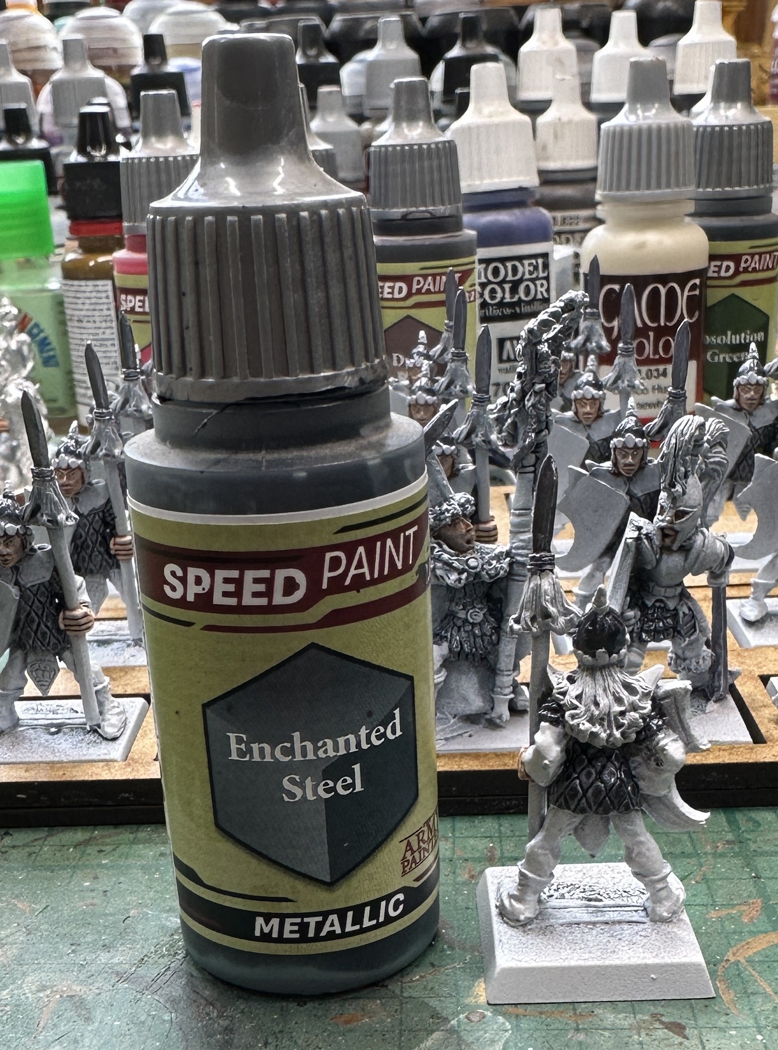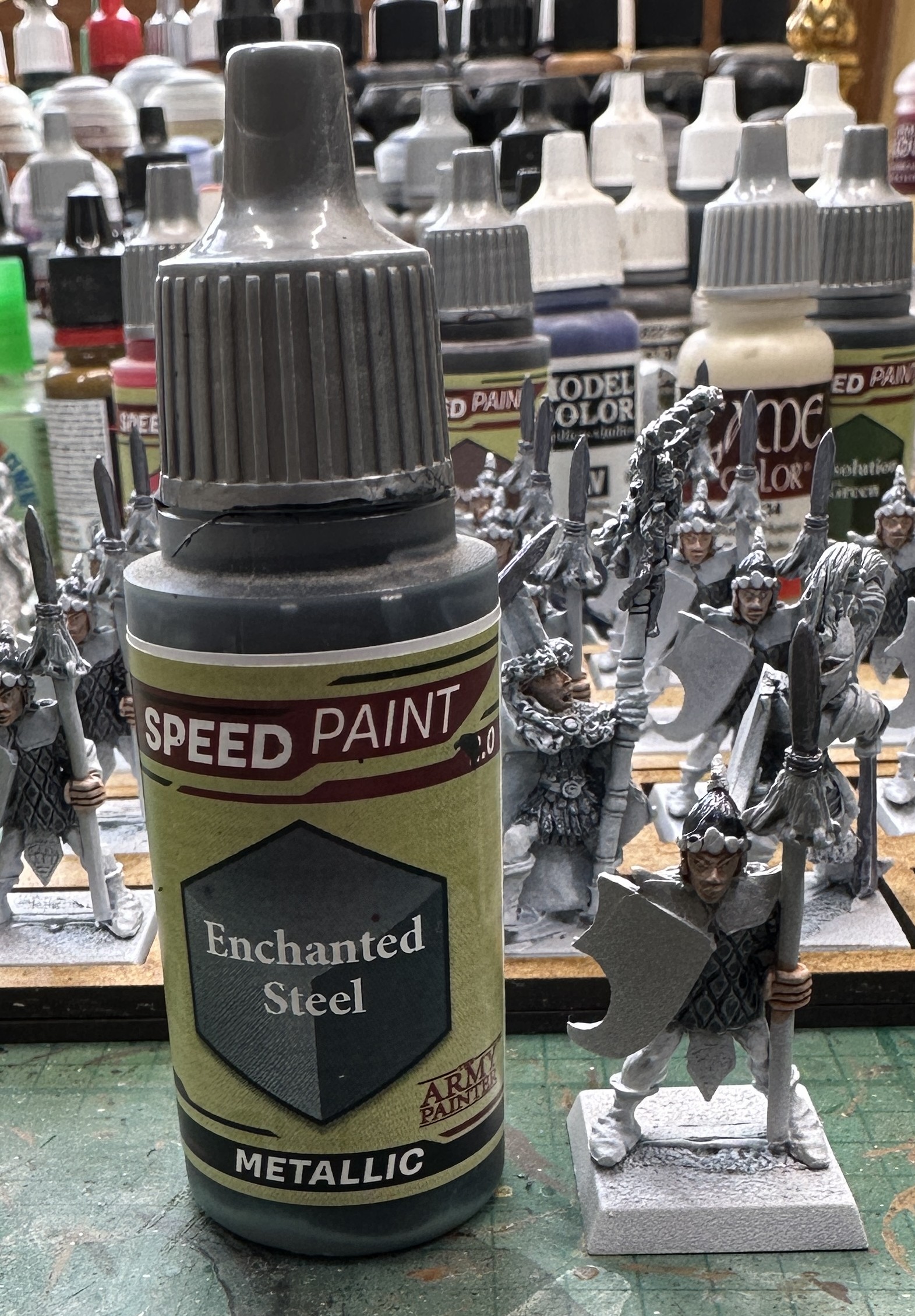 Next I did the steel metallics. A silver undertone on the spear heads and then my more usual choice for Elven steel, Enchanted Steel on the scale hauberks and helmets.