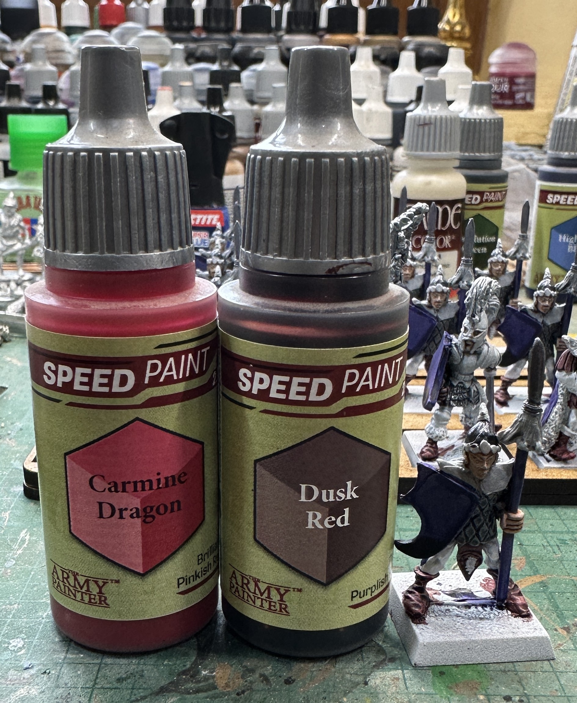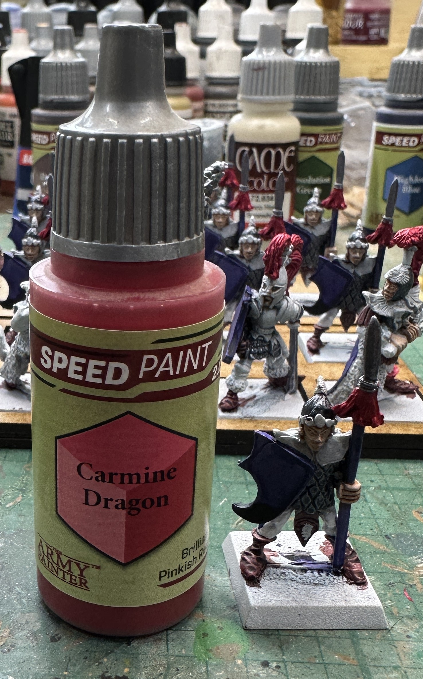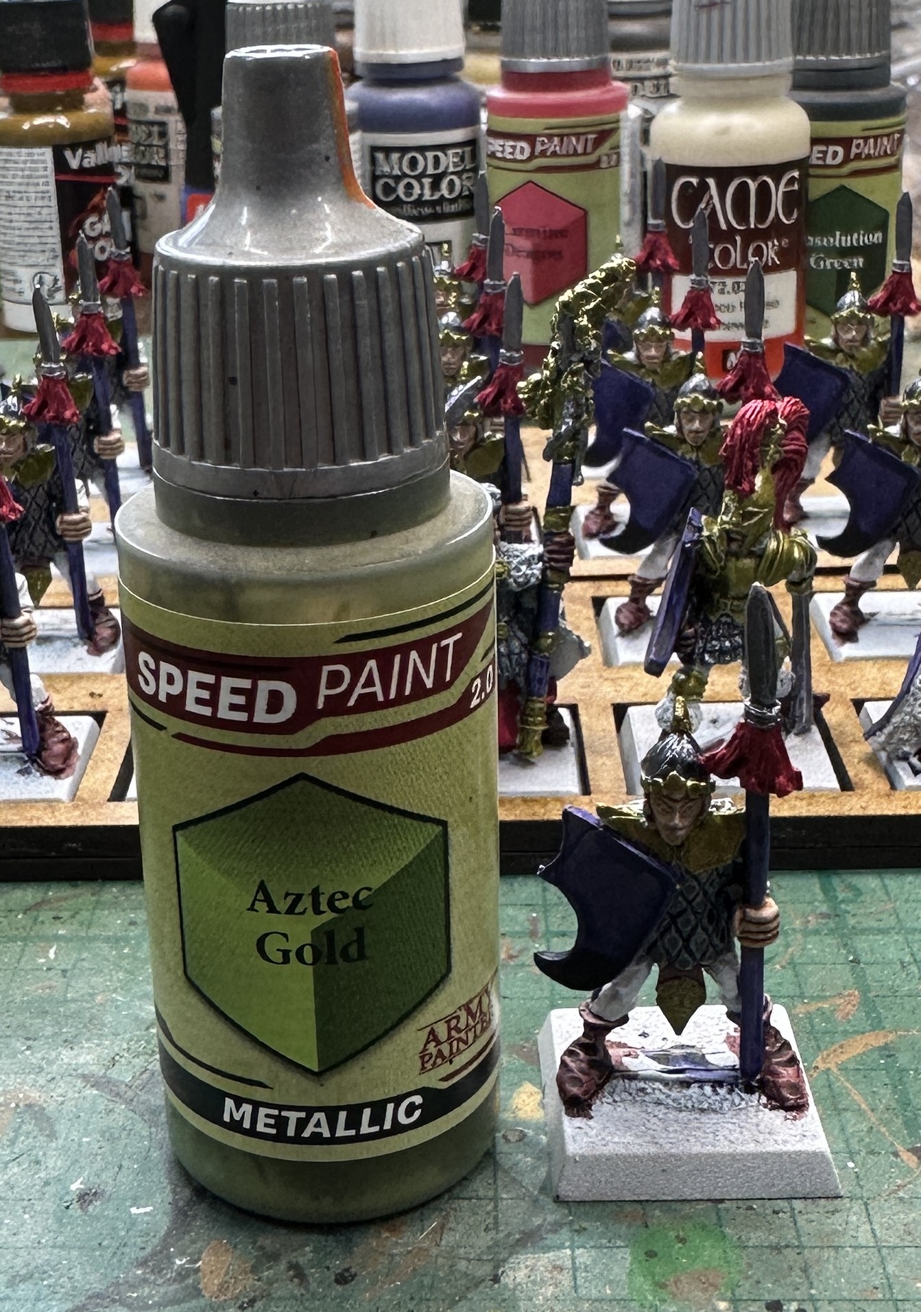 The contrast colours now. Red for the spear fringe and my usual Elven choice of a greenish shade of gold for their shoulder guards.