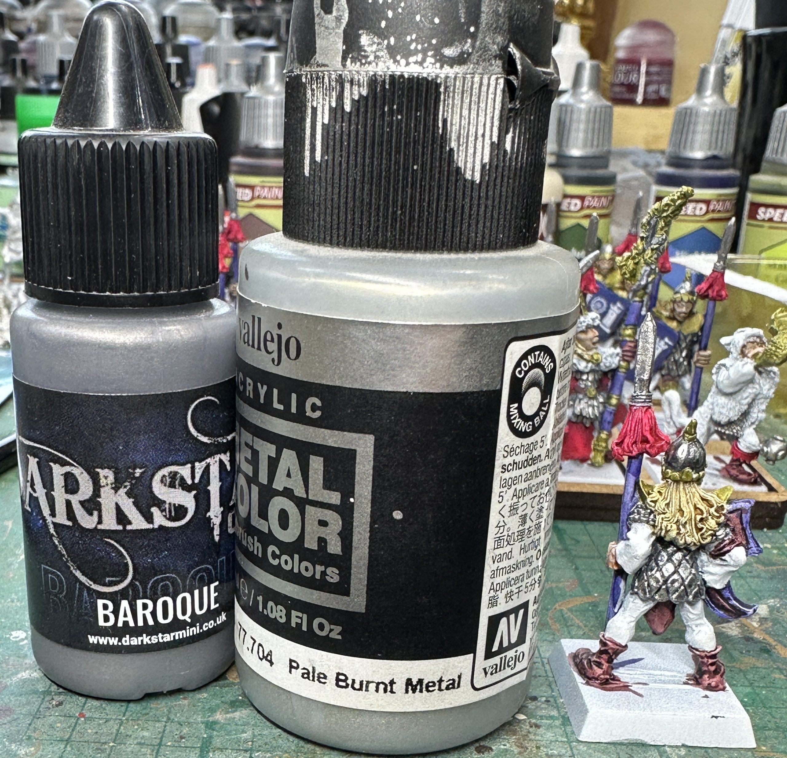 - Steel and chainmail. Everythnig is given a generous drybrush with Dark Star Steel, leaving just joining edges and deeper recesses. Then Darkstar Baroque with a lighter drybrush or direct application onto the upper half of blades and the upper surfaces of chainmail. Finally top edge highlights, blade edges and any top surfaces and corners are picked out with Vallejo Metal Colour Pale Burnt Metal.