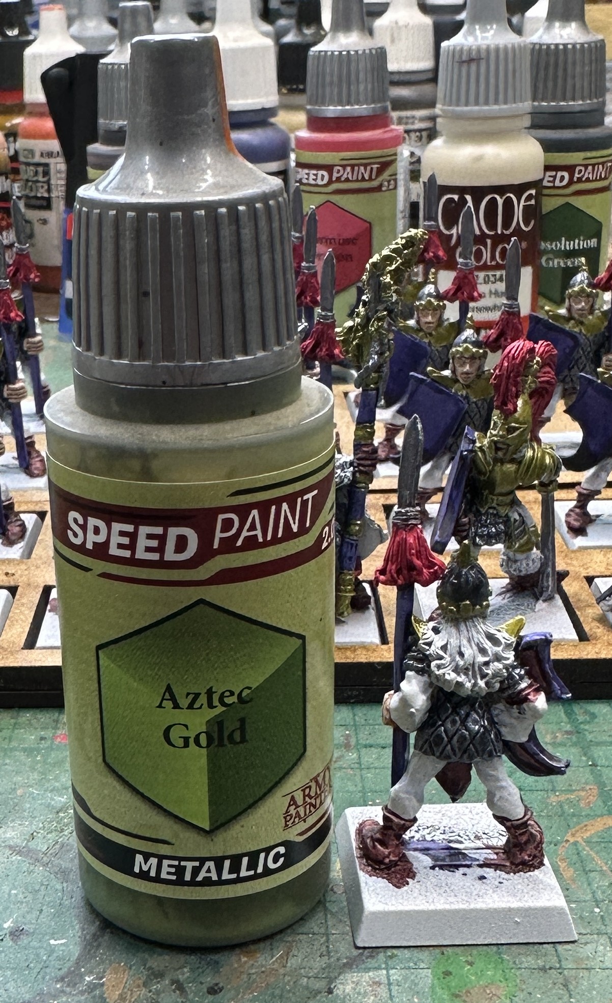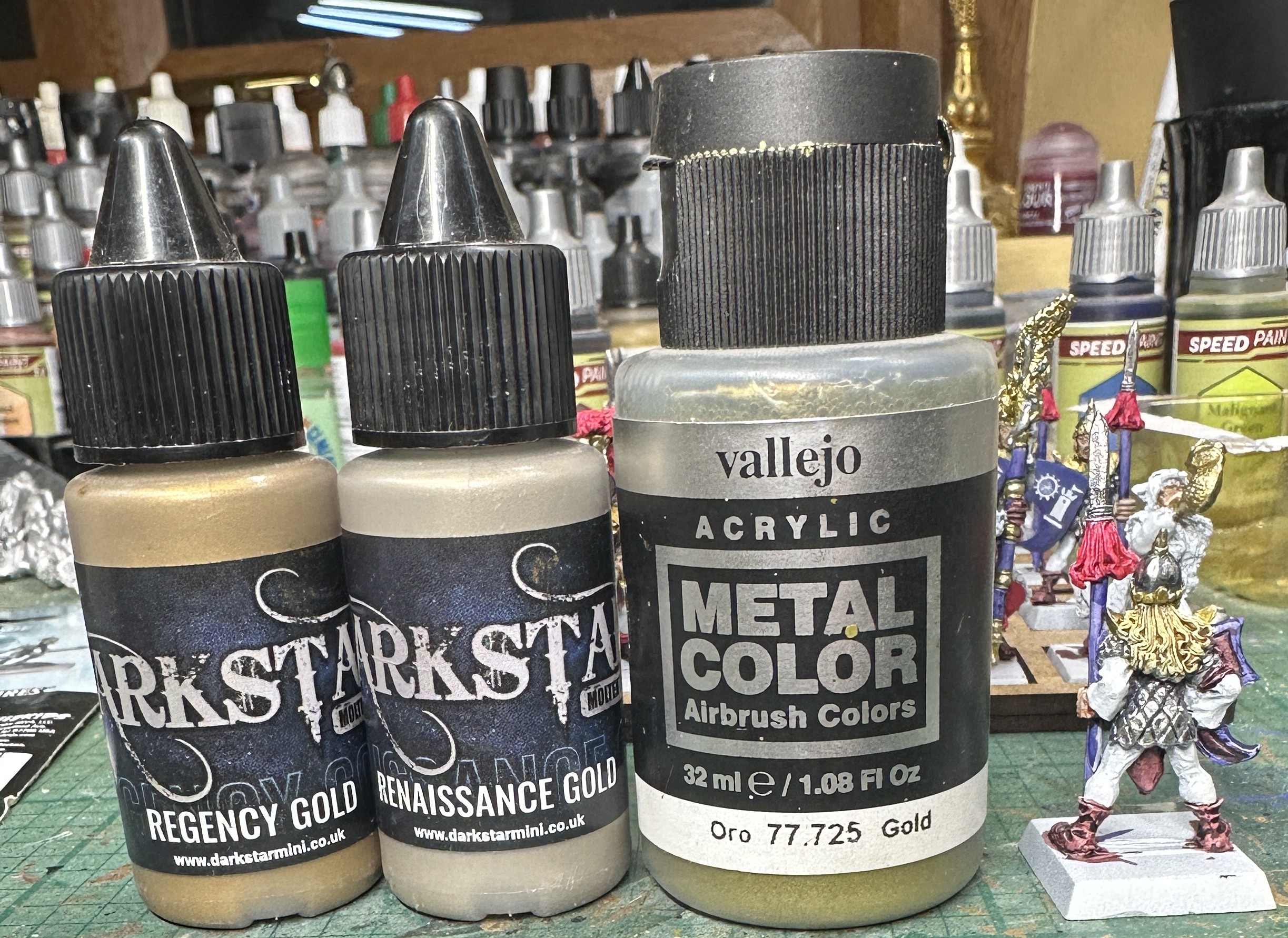 - Armour plates and jewellery. Because I’m working up from Aztec Gold which has a slightly green undertone I’m not layering up with anything too orangey or warm in tone. I started with Darkstar Regency Gold over the top 2/3 of surfaces. Then Darkstar Renaissance Gold over the top 1/3 and a final upper edges and top pointy bits highlight with Vallejo Metal Colour Gold which brings back some of the green based look in the top highlight.