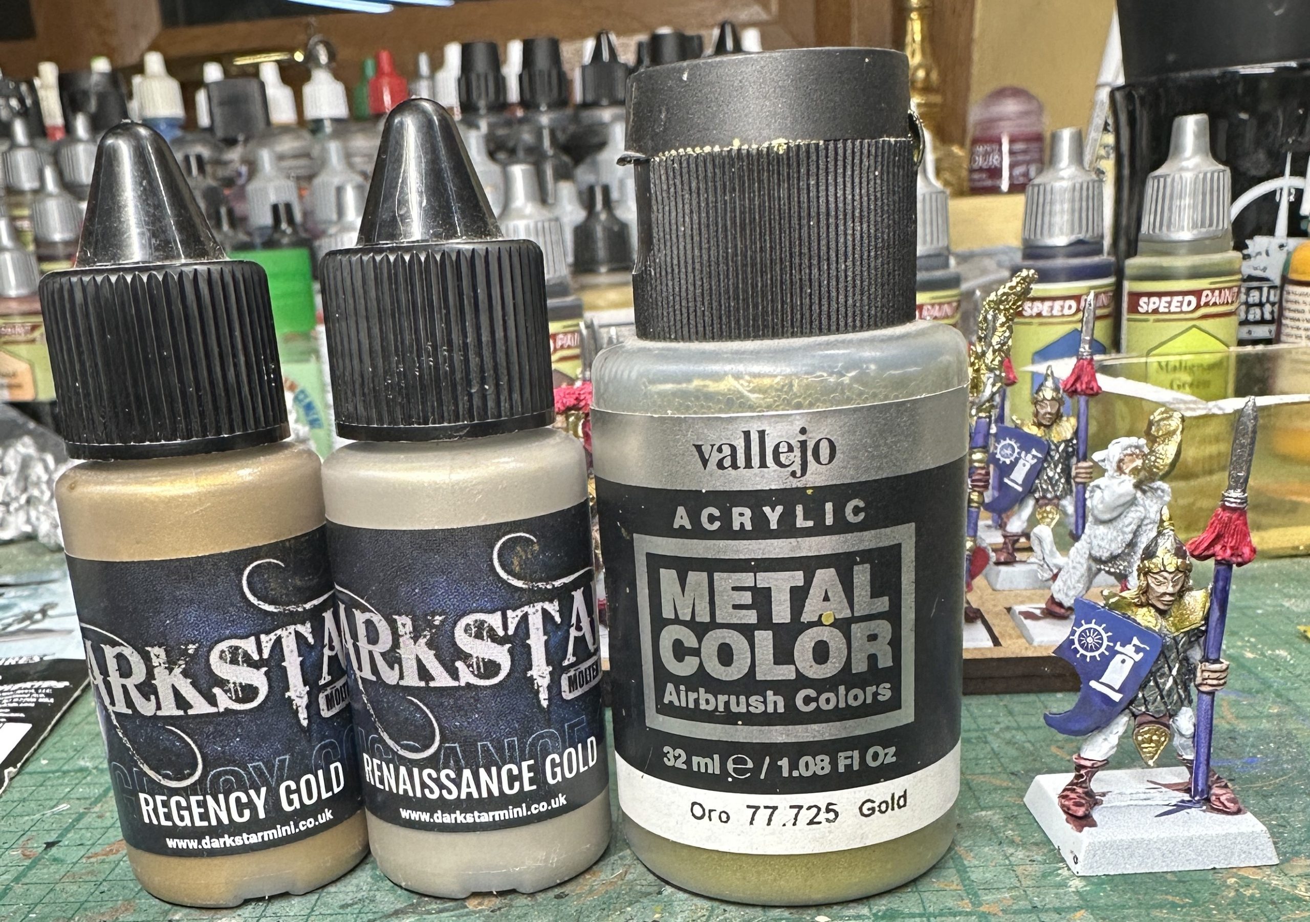 Now on to the gilded armour and gold weapon fitments. To get a bright shine I have to add an extra layer. Starting with Regency Gold I overpaint in the same way as I did on the steel, leaving the original colour in recesses and at the joins between colours. Next I went with another Darkstar paint, Renaissance Gold. This is very bright and would normally be the top highlight but we want our elves extra shiny. This went into the usual highlight positions at the top of high points and edges. I also picked a notional direction for light, from the upper left of the front of the miniature, at 11 o’clock. Then put patches of highlight onto the flatter plates and surfaces where this light would hit them. Finally a top and edge highlight using Vallejo Metal Gold. In small quantities this has a colour appropriate chrome finish.