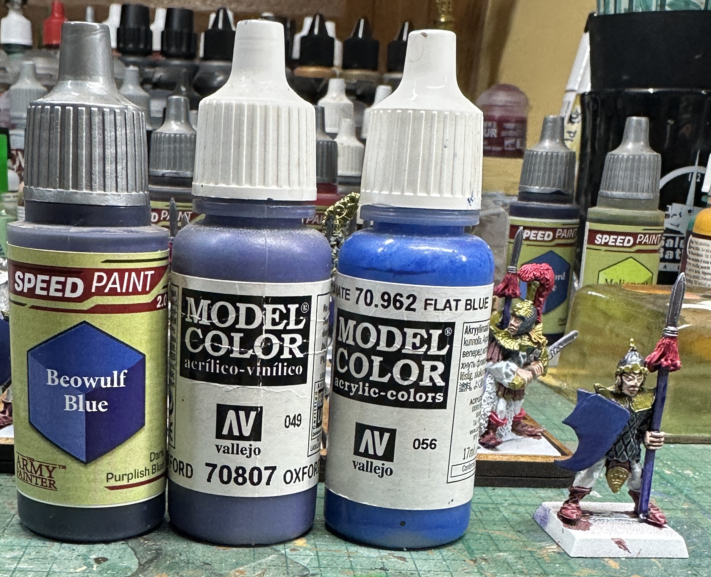 Now for some colour. Blue to start off with on shield faces and rims and then the spear shaft. After that I blended a couple of drops of red into 10 of the leather colour to just up the reddish tint a bit. That went onto shoes and some leather details on the characters.