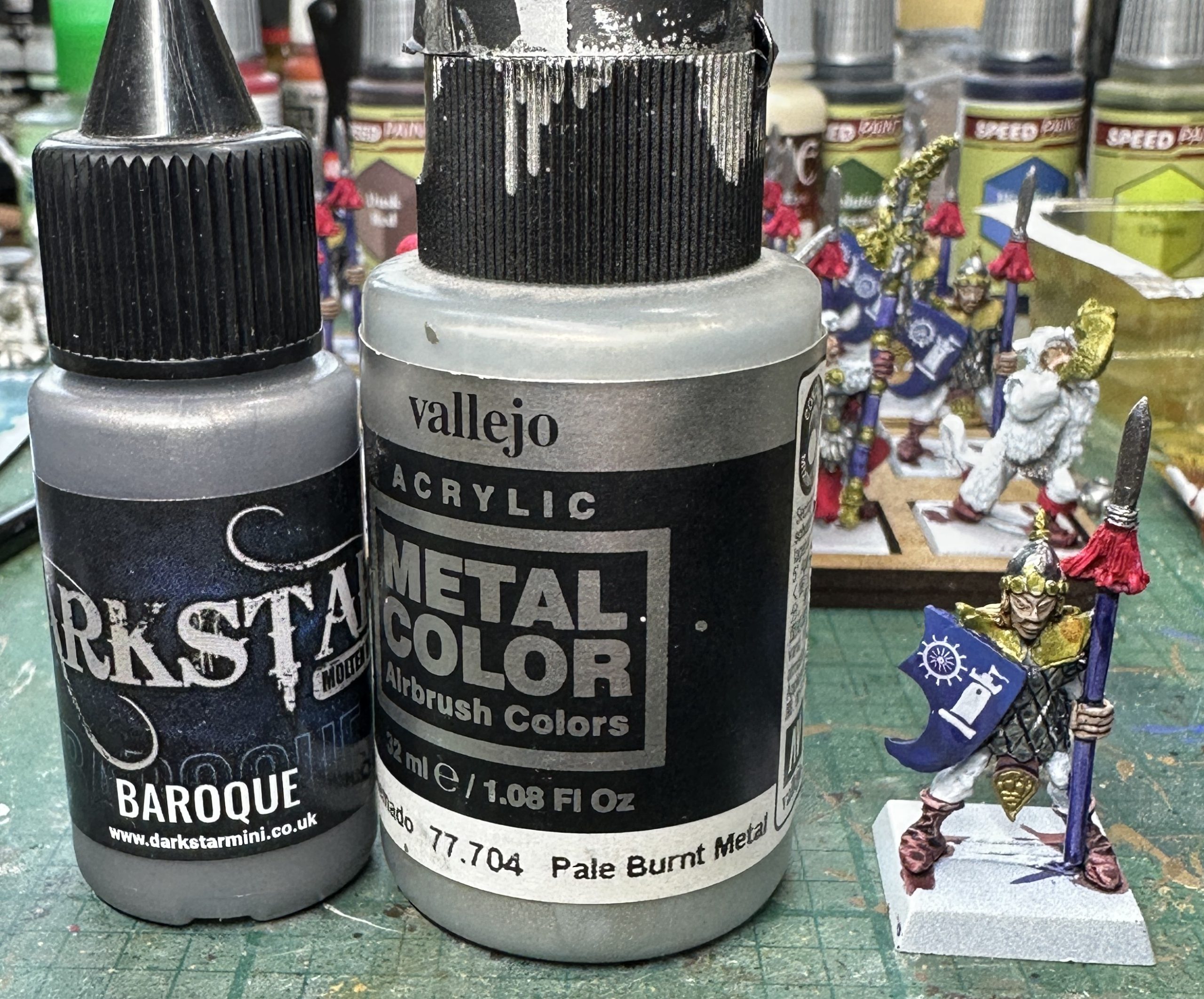 I use Darkstar Baroque to put the basic metal shine back onto the figures. Not a complete overpaint layer, I’m leaving the edges and low points in the Enchanted Steel. Over that just on the edges of weapons, tips and high shine points on armour I use Vallejo Metal Pale Burnt Metal. This is almost a chrome finish – the clearest I’ve found as the pigment is very fine so it doesn’t make the finish grainy.