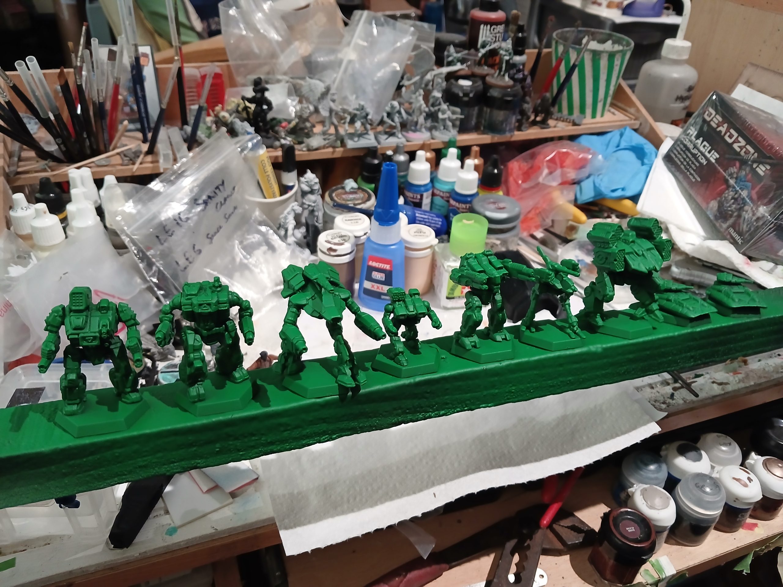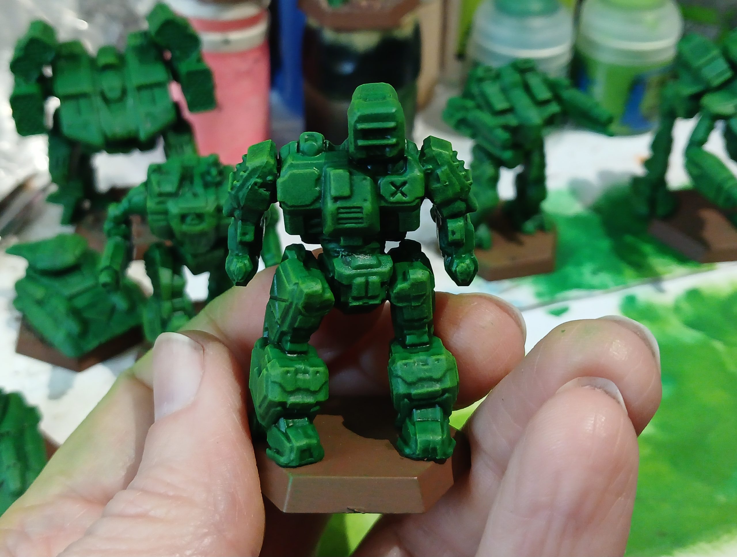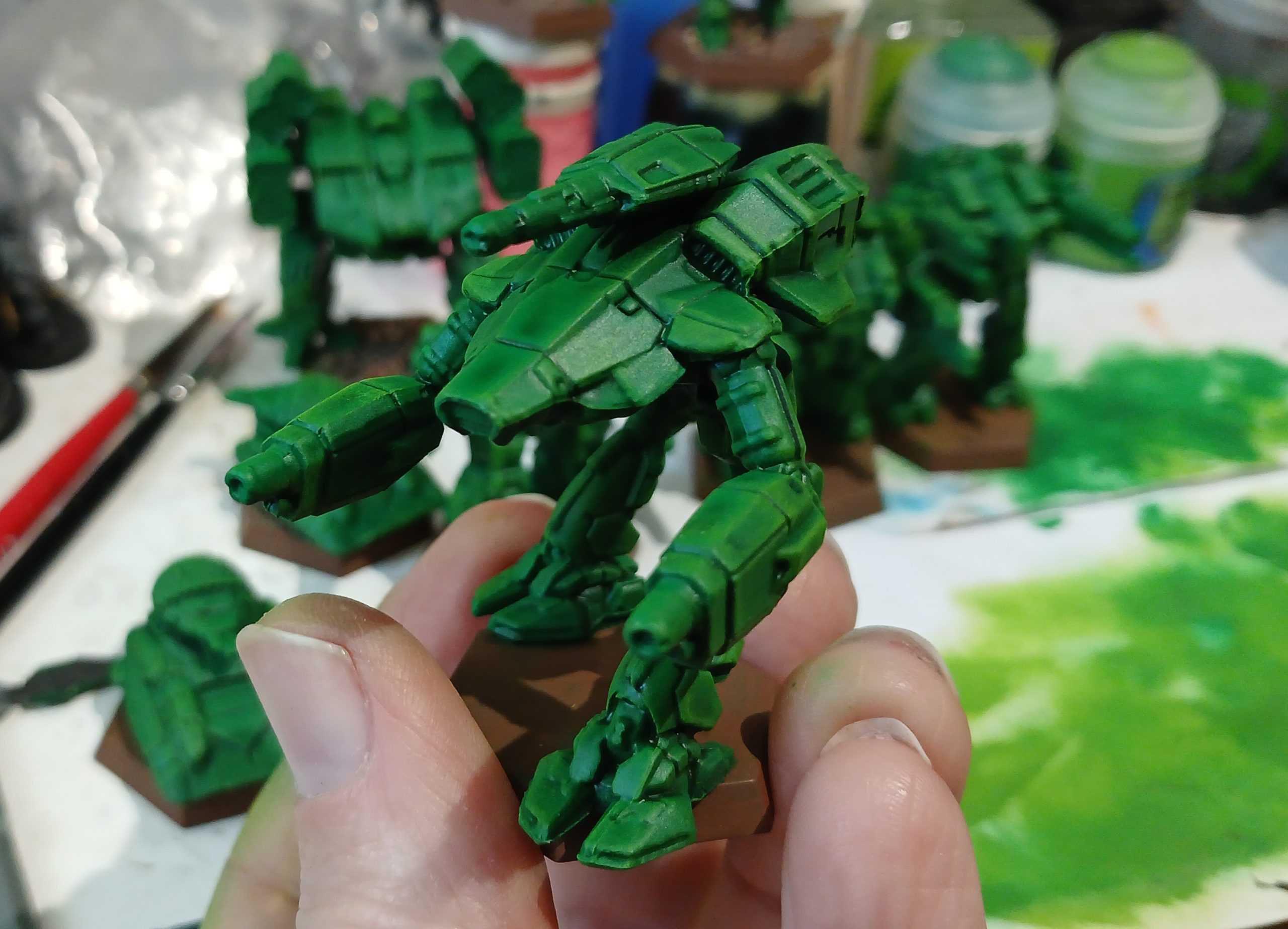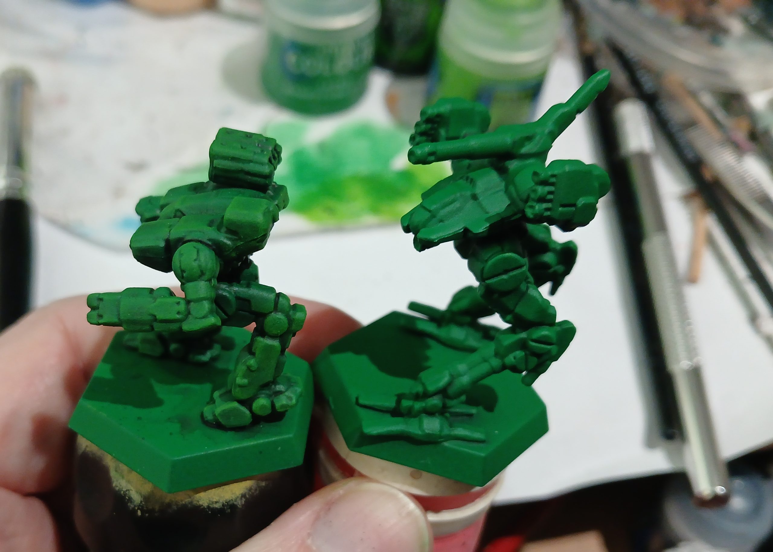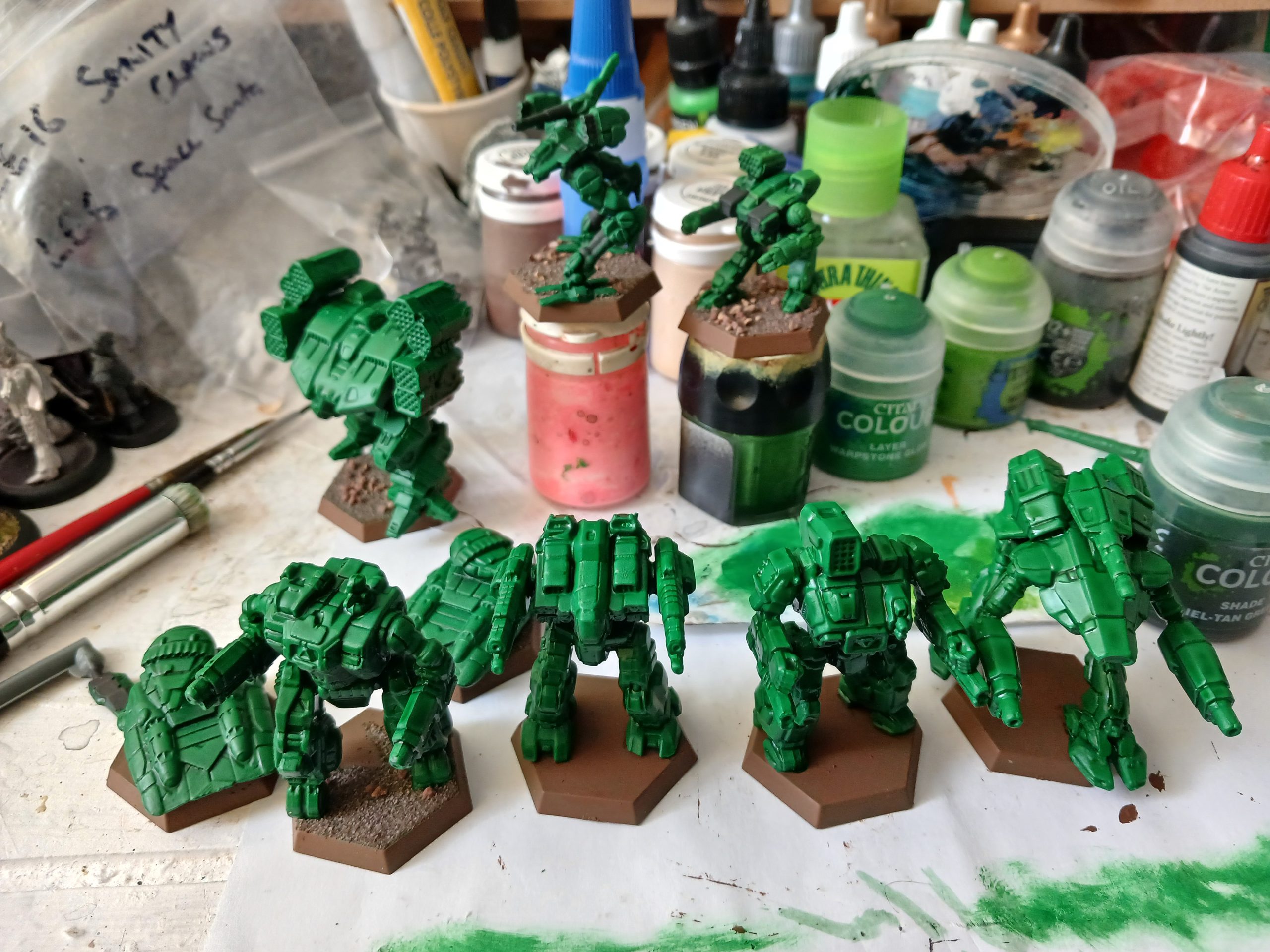 I started out with the enemy faction from the Scouring Sands box. Since these represent Clan Jade Falcon there was just limited dithering deciding on a green shade. I purchased a new can of Salamander Green (Colour Forge).