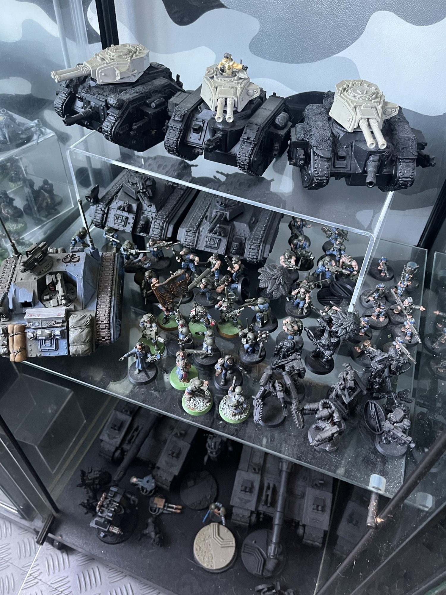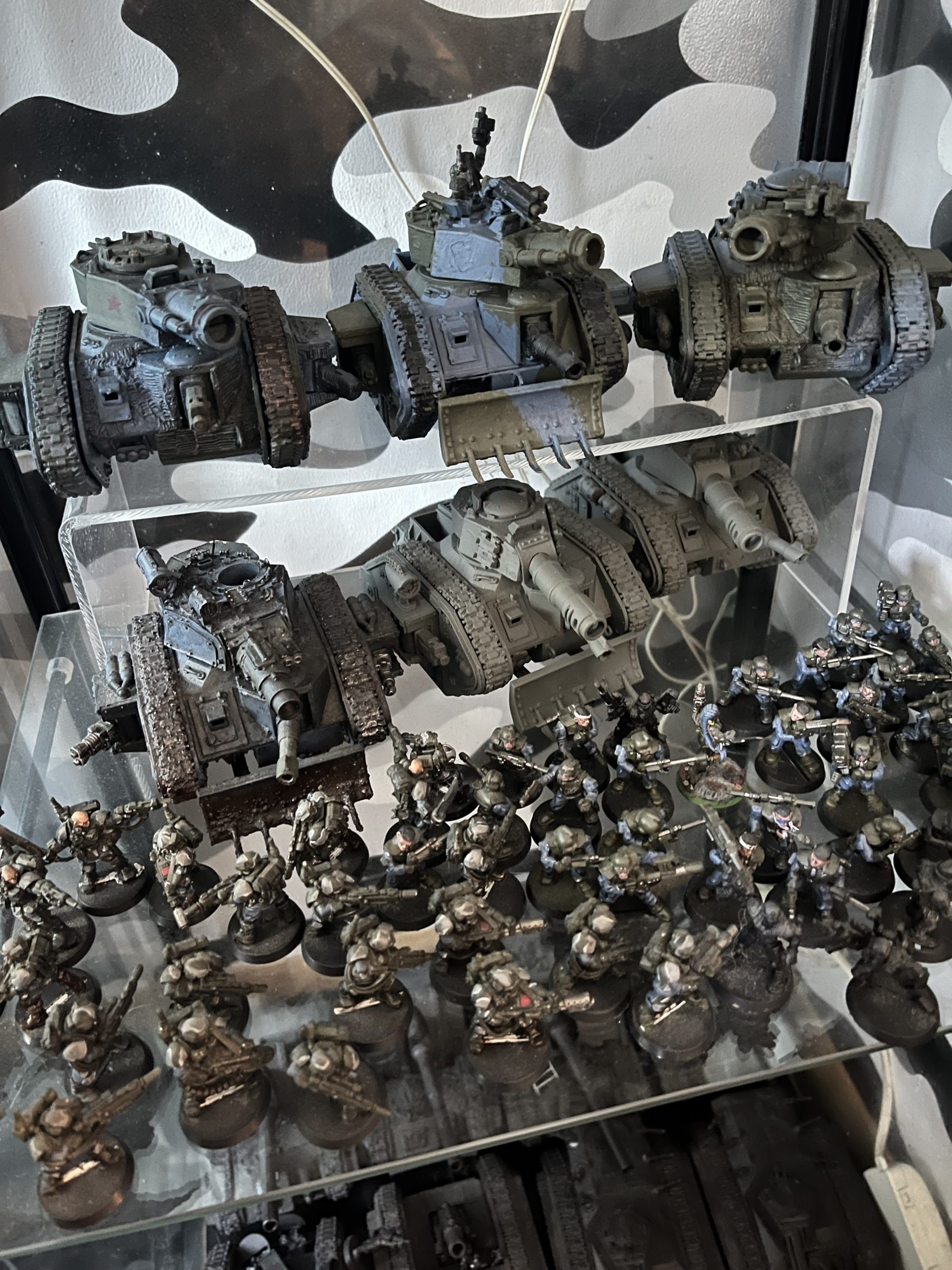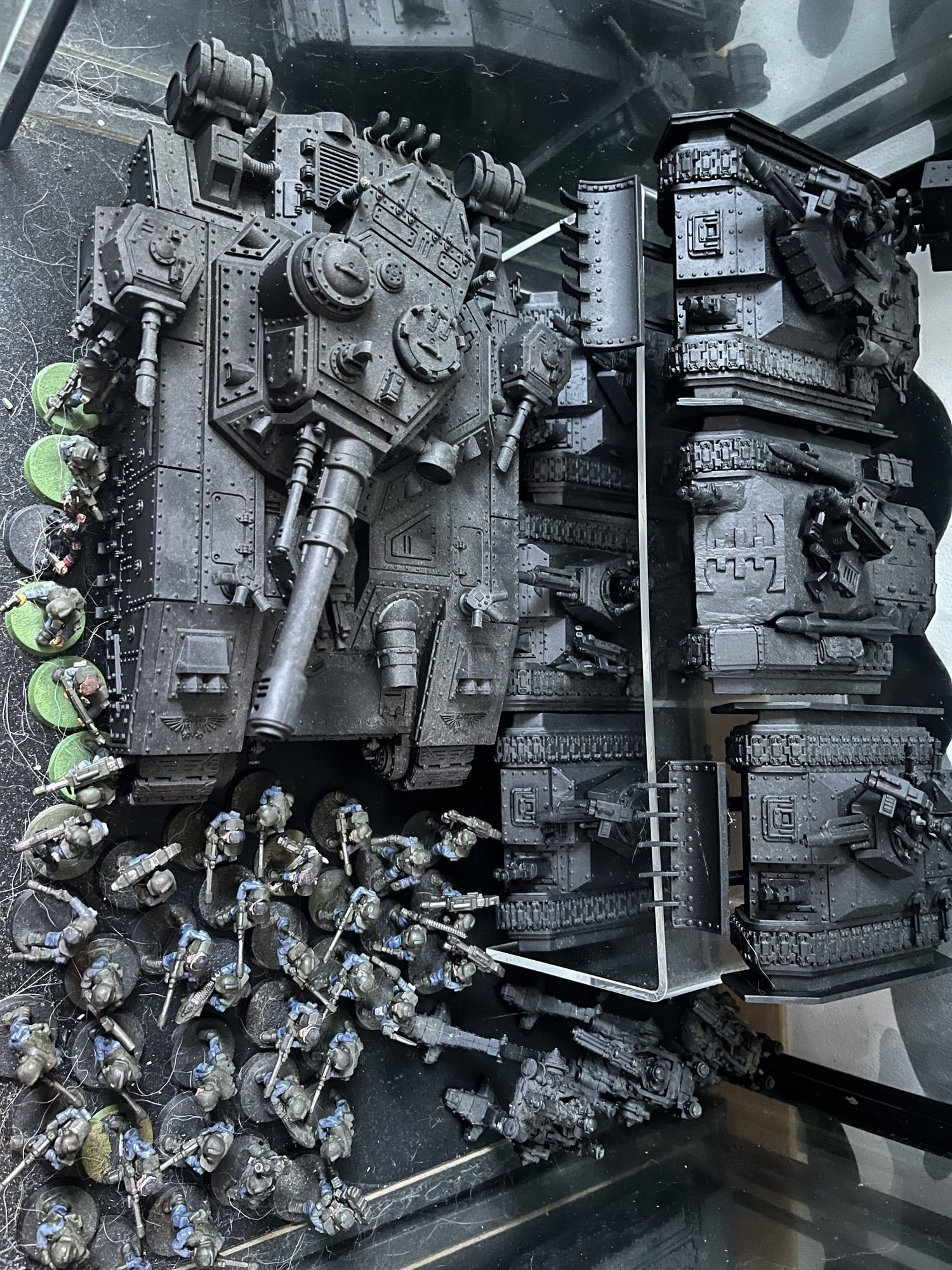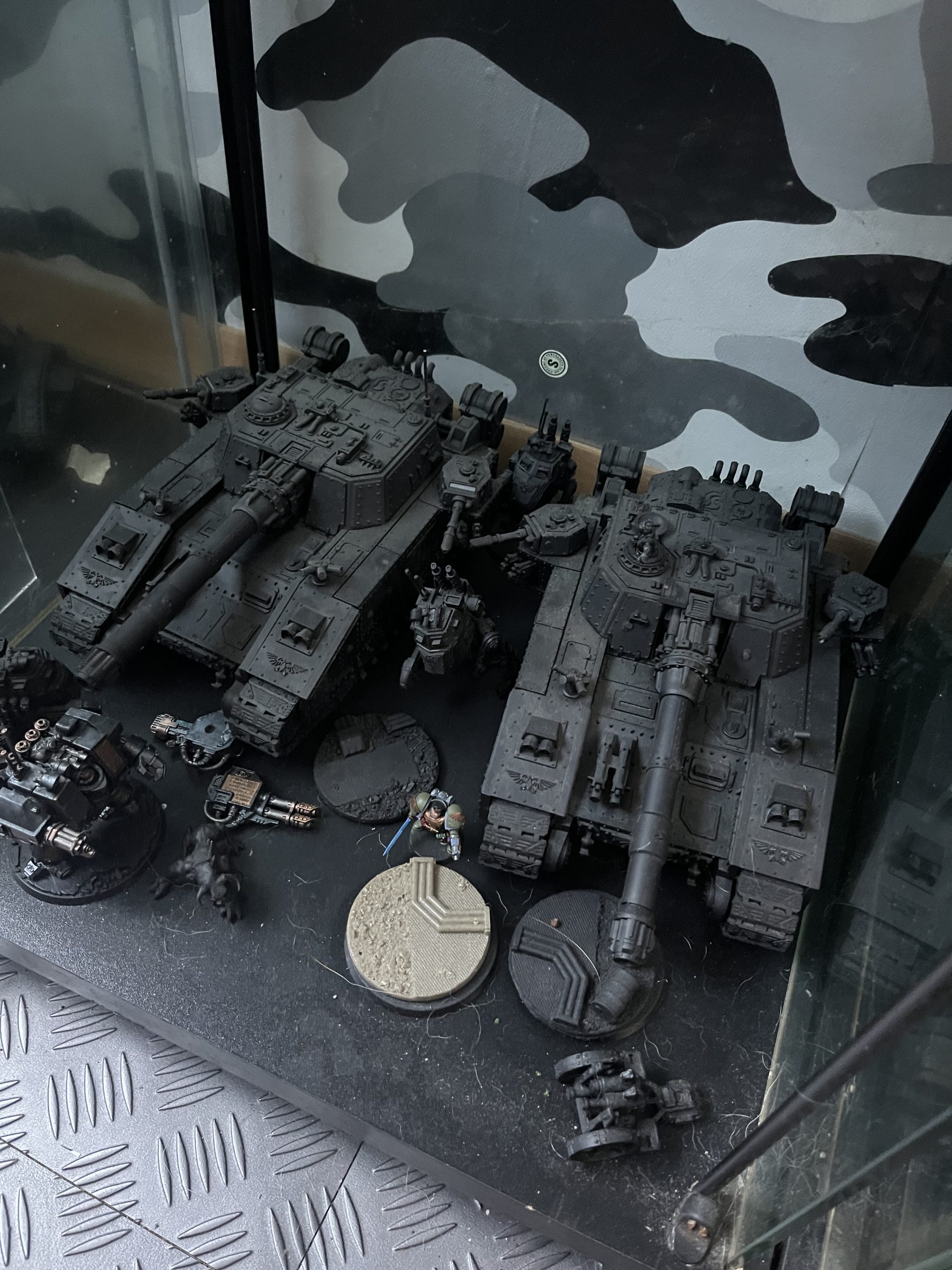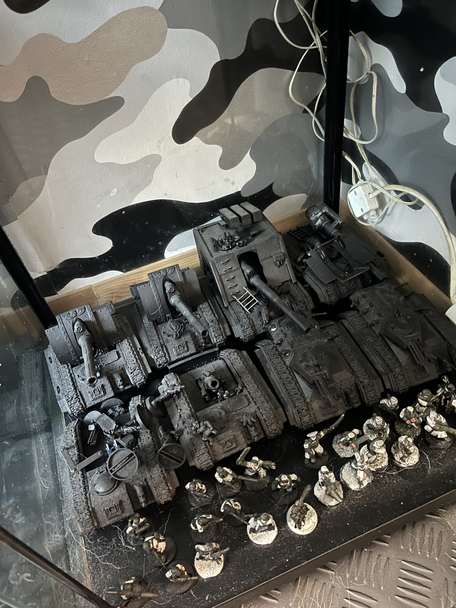 Sometime in the very early 90's, while I was in primary school I was introduced to this thing called White Dwarf - there was a battle report in it that locked into my brain, Epic scale, Imperial guard vs Eldar and I was instantly imprinted - Massed artillery, huge tanks and the idea of normal man facing off against the galaxy set me from day 1, I would play the guard. A bit of negotiating with my dad and we obtained a copy of Rogue trader and a box of marines - we went upscale to 40k. Shortly after the first boxed edition dropped and we we in, I had to have guard... Fast forward 10 years and I had my army and we were playing regularly (I didn't win much!) and my collecting was in overdrive. Then came working life and children and as these things happen I couldn't keep up with the edition churn I lost my love of 40k & it got shelved. Somewhere between then and now I had re-undercoated all the vehicles I had so it wasn't a riot of colour any longer, just a wall of black tanks and massed infantry in various stages of paint. Other games have come and then joined the guard on the shelves, warmachine, x-wing, cruel seas & more but the guard have sat waiting. A couple of months ago my only just a teenage son decided he wanted to do some orks - he's been making odd models for years but he has had his calling as a speed freak, then I saw the announcement that the next edition of 40k was to be a rerun of my first boxed one. Then the spring clean challenge notice. The universe is telling me it is time to get these tanks back into action.