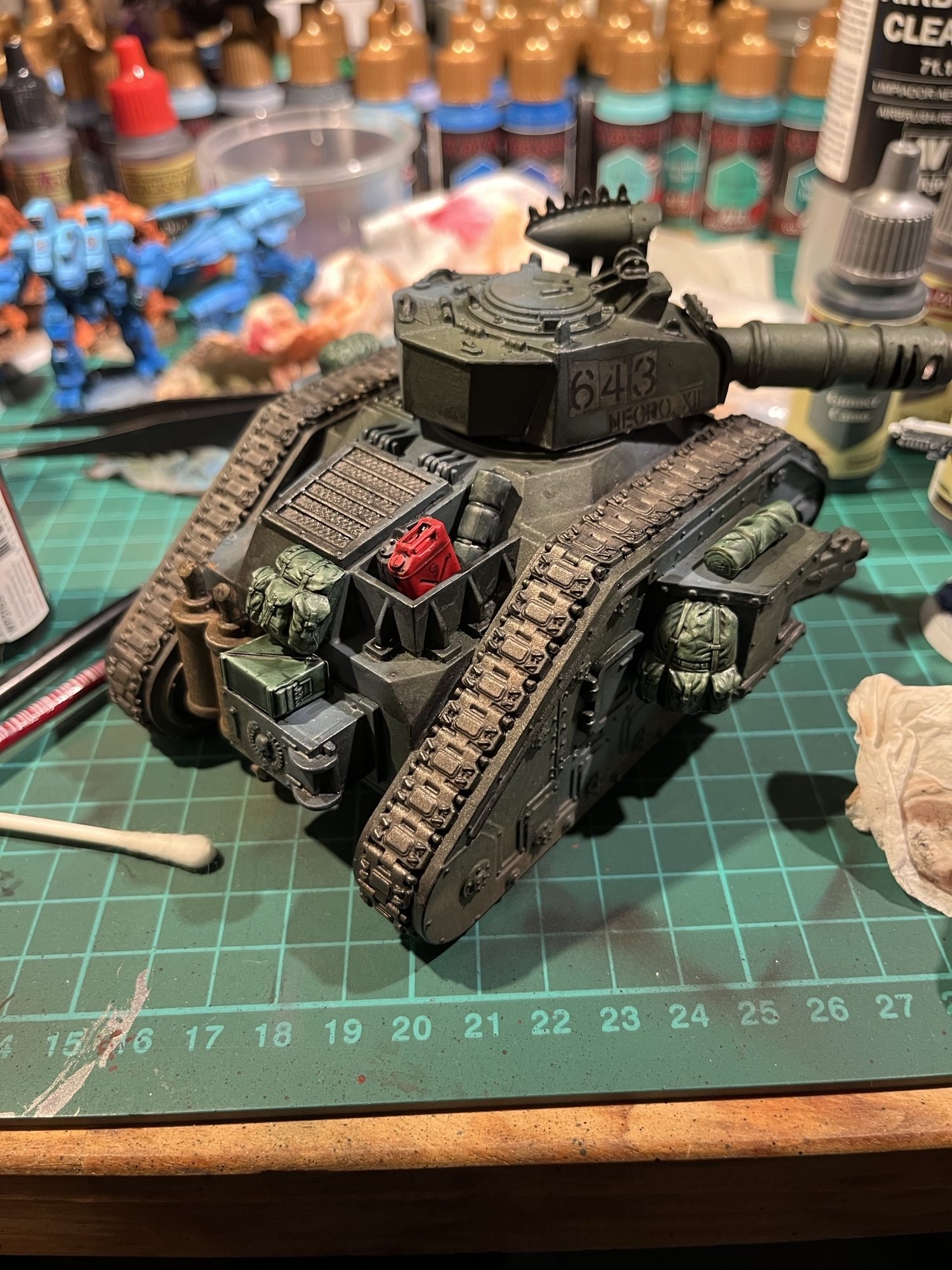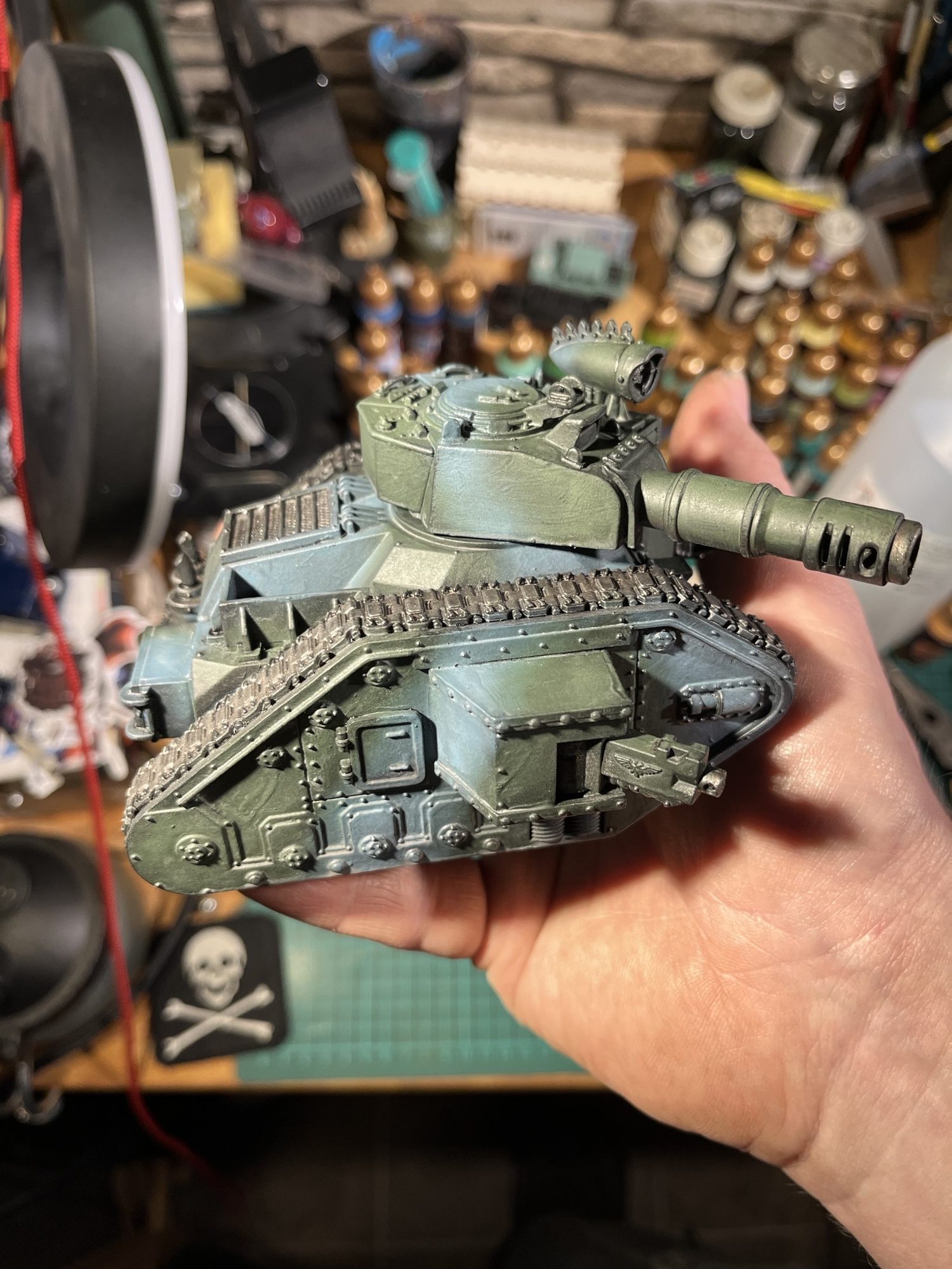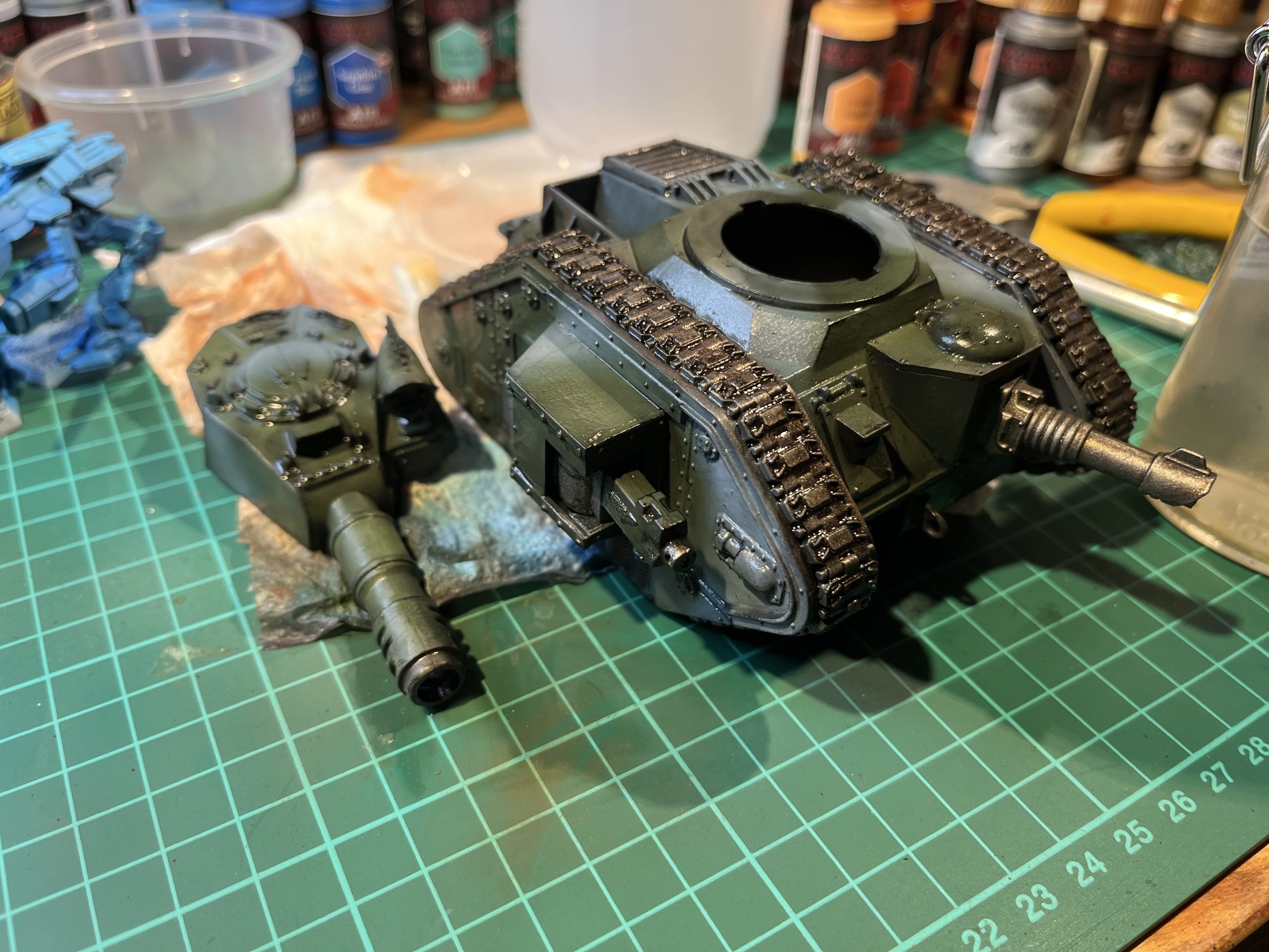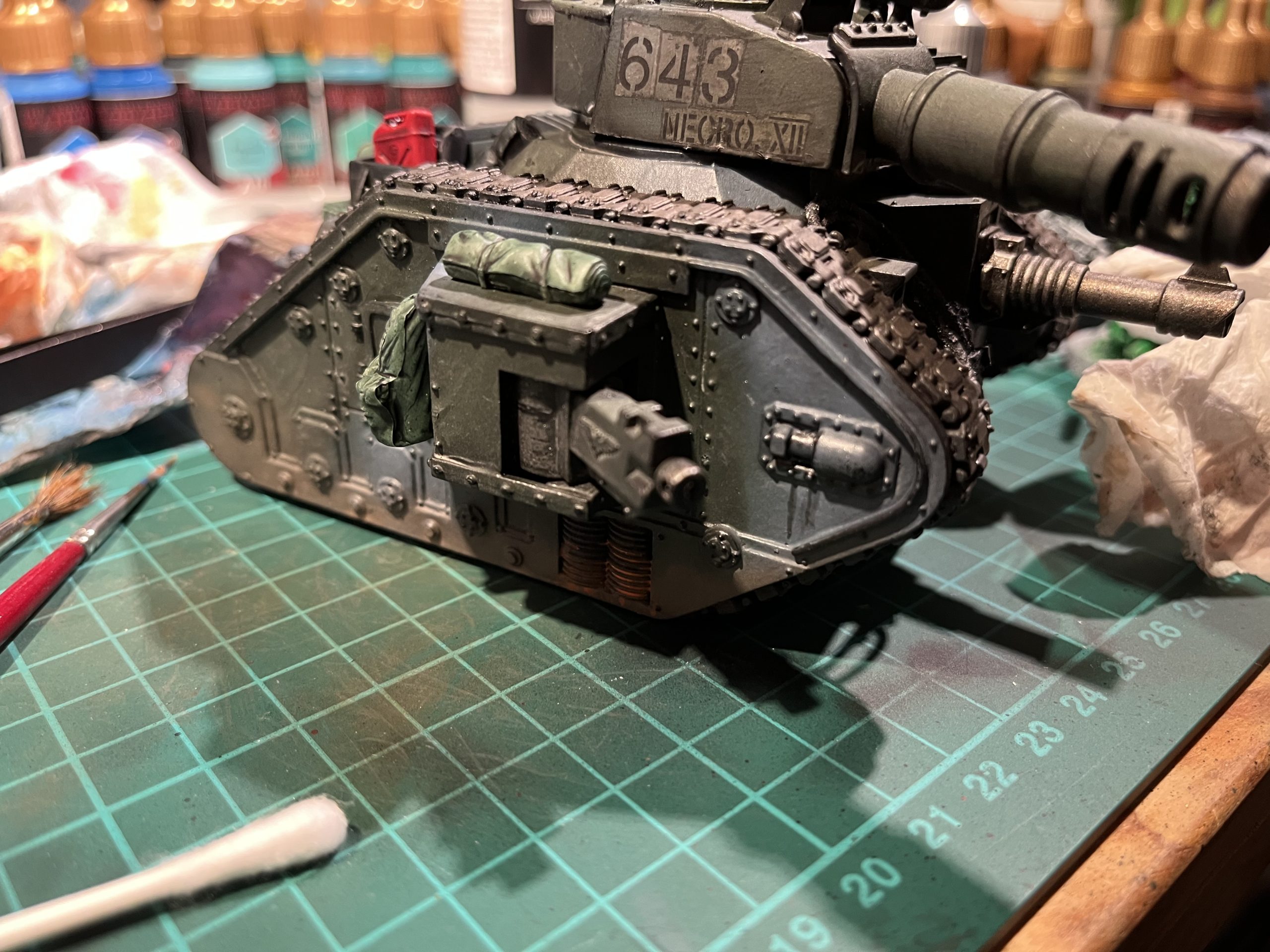Sometime in the very early 90's, while I was in primary school I was introduced to this thing called White Dwarf - there was a battle report in it that locked into my brain, Epic scale, Imperial guard vs Eldar and I was instantly imprinted - Massed artillery, huge tanks and the idea of normal man facing off against the galaxy set me from day 1, I would play the guard. A bit of negotiating with my dad and we obtained a copy of Rogue trader and a box of marines - we went upscale to 40k. Shortly after the first boxed edition dropped and we we in, I had to have guard... Fast forward 10 years and I had my army and we were playing regularly (I didn't win much!) and my collecting was in overdrive. Then came working life and children and as these things happen I couldn't keep up with the edition churn I lost my love of 40k & it got shelved. Somewhere between then and now I had re-undercoated all the vehicles I had so it wasn't a riot of colour any longer, just a wall of black tanks and massed infantry in various stages of paint. Other games have come and then joined the guard on the shelves, warmachine, x-wing, cruel seas & more but the guard have sat waiting. A couple of months ago my only just a teenage son decided he wanted to do some orks - he's been making odd models for years but he has had his calling as a speed freak, then I saw the announcement that the next edition of 40k was to be a rerun of my first boxed one. Then the spring clean challenge notice. The universe is telling me it is time to get these tanks back into action.