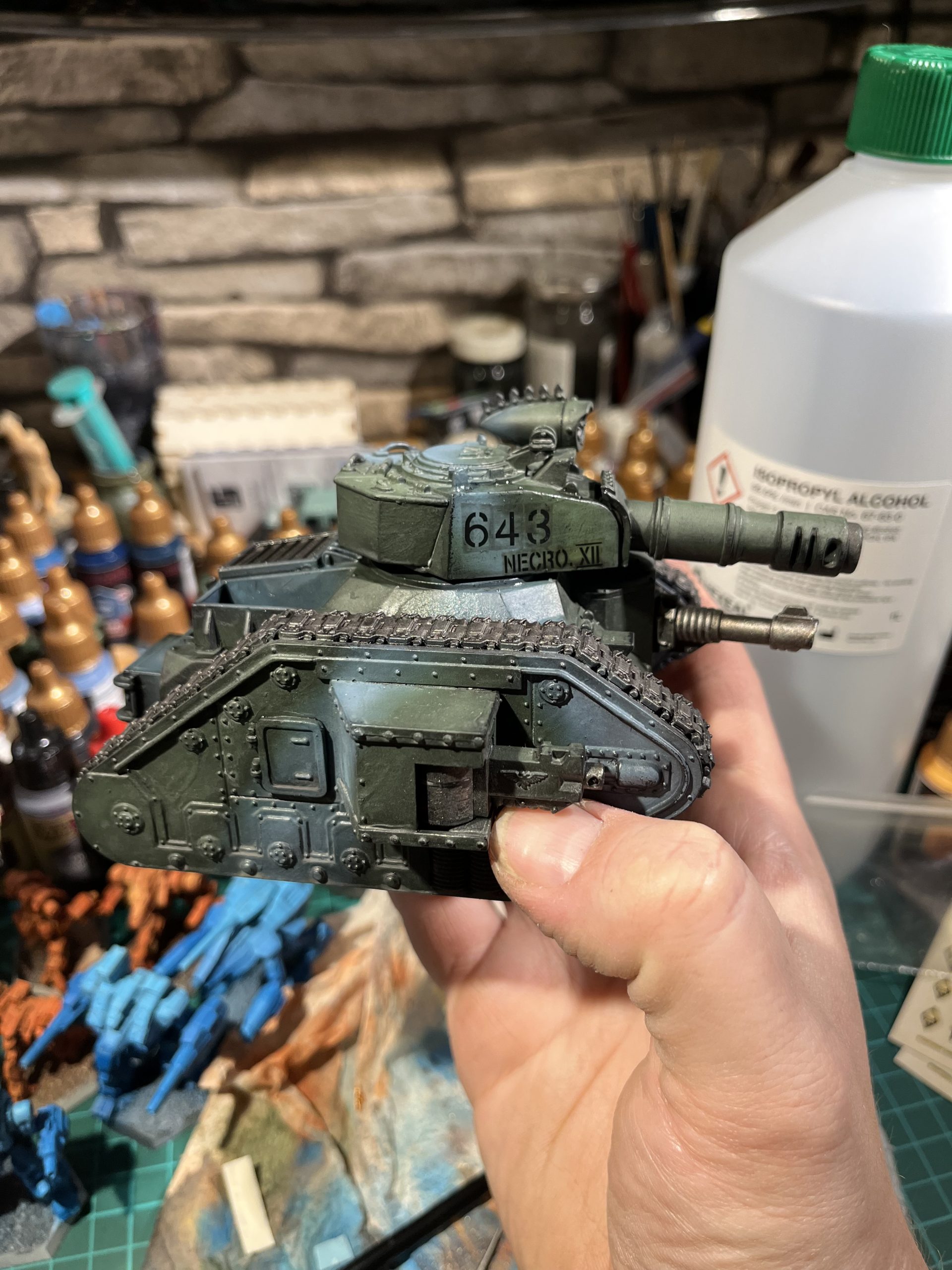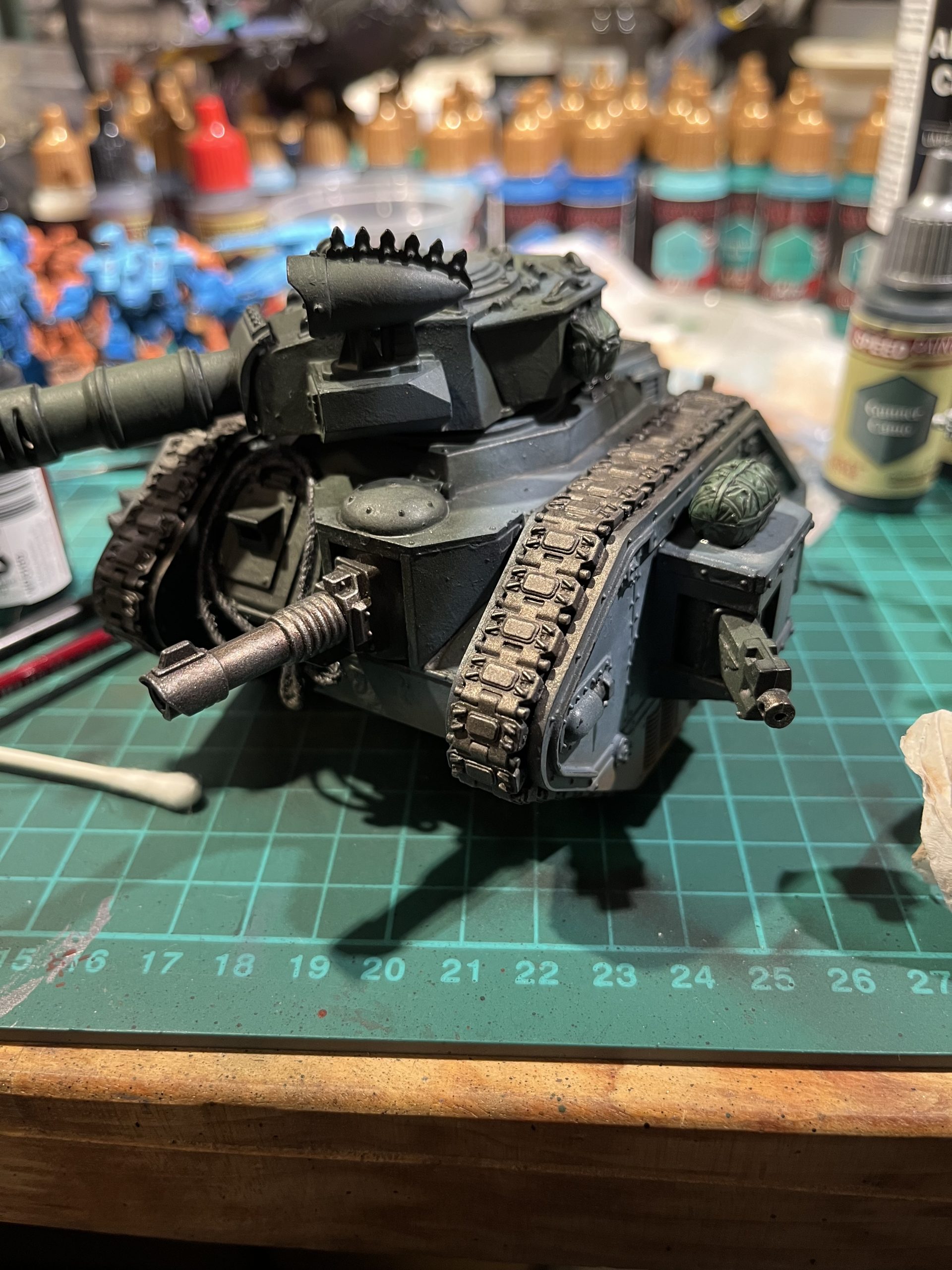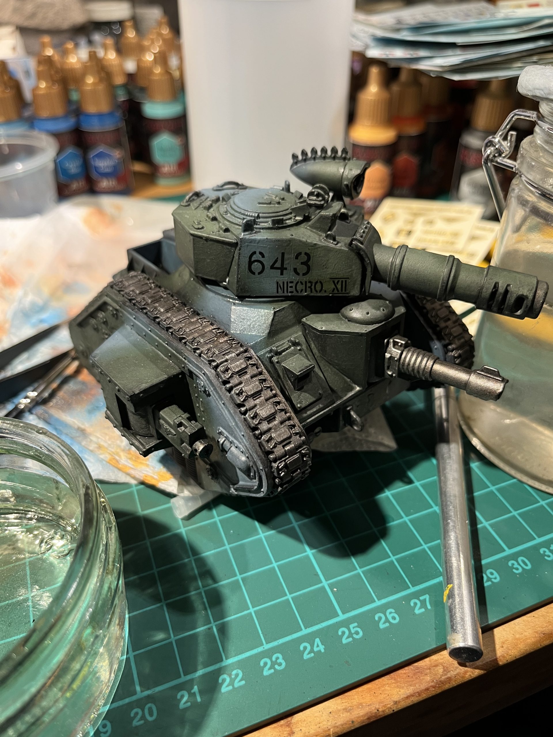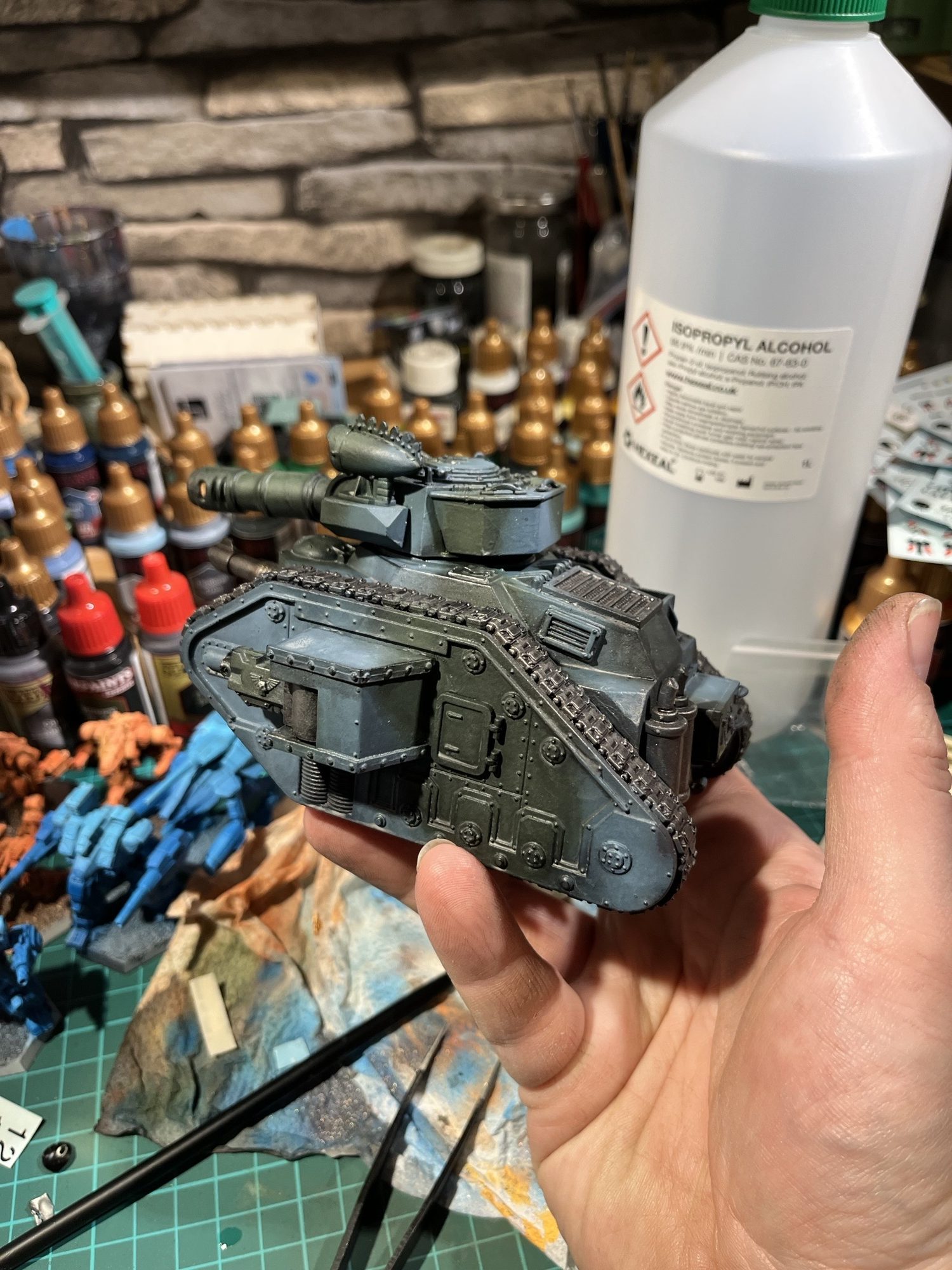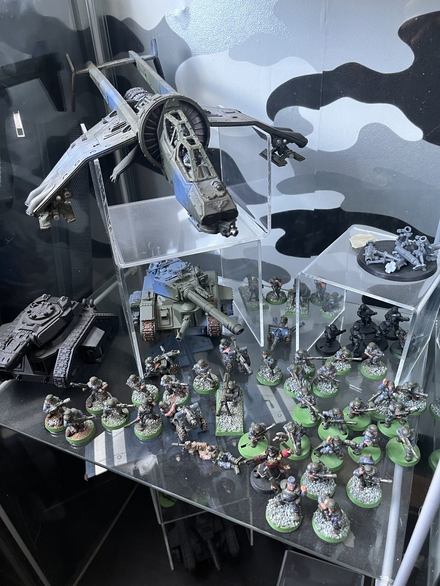 Sometime in the very early 90's, while I was in primary school I was introduced to this thing called White Dwarf - there was a battle report in it that locked into my brain, Epic scale, Imperial guard vs Eldar and I was instantly imprinted - Massed artillery, huge tanks and the idea of normal man facing off against the galaxy set me from day 1, I would play the guard. A bit of negotiating with my dad and we obtained a copy of Rogue trader and a box of marines - we went upscale to 40k. Shortly after the first boxed edition dropped and we we in, I had to have guard... Fast forward 10 years and I had my army and we were playing regularly (I didn't win much!) and my collecting was in overdrive. Then came working life and children and as these things happen I couldn't keep up with the edition churn I lost my love of 40k & it got shelved. Somewhere between then and now I had re-undercoated all the vehicles I had so it wasn't a riot of colour any longer, just a wall of black tanks and massed infantry in various stages of paint. Other games have come and then joined the guard on the shelves, warmachine, x-wing, cruel seas & more but the guard have sat waiting. A couple of months ago my only just a teenage son decided he wanted to do some orks - he's been making odd models for years but he has had his calling as a speed freak, then I saw the announcement that the next edition of 40k was to be a rerun of my first boxed one. Then the spring clean challenge notice. The universe is telling me it is time to get these tanks back into action.