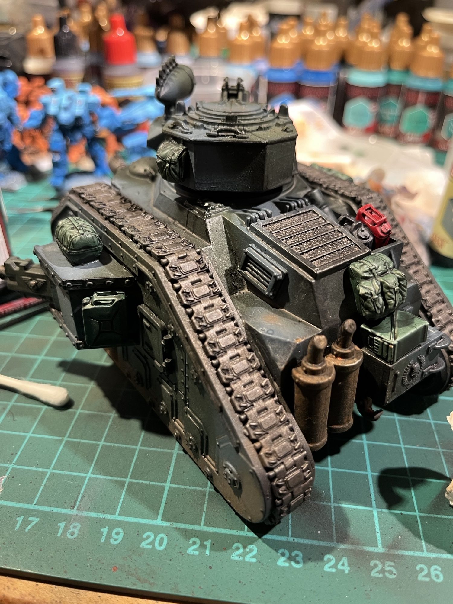 With a little splash of speed paint on some model stowage and a towcable made from a bit of string to complete I’m calling this one done! I’ve sprayed a light dusting and added a touch of rust and oil effects I’m still practicing with – I’m not happy with the old decals and the way they’ve interacted with the wash but I realised looking back at the hellhounds (which were the only unit I actually finished before they were put away) I think I’d used a decalfix solution or similar & mine has long since dried up. I’ll have to see what I can find out there that will improve those transfer films!